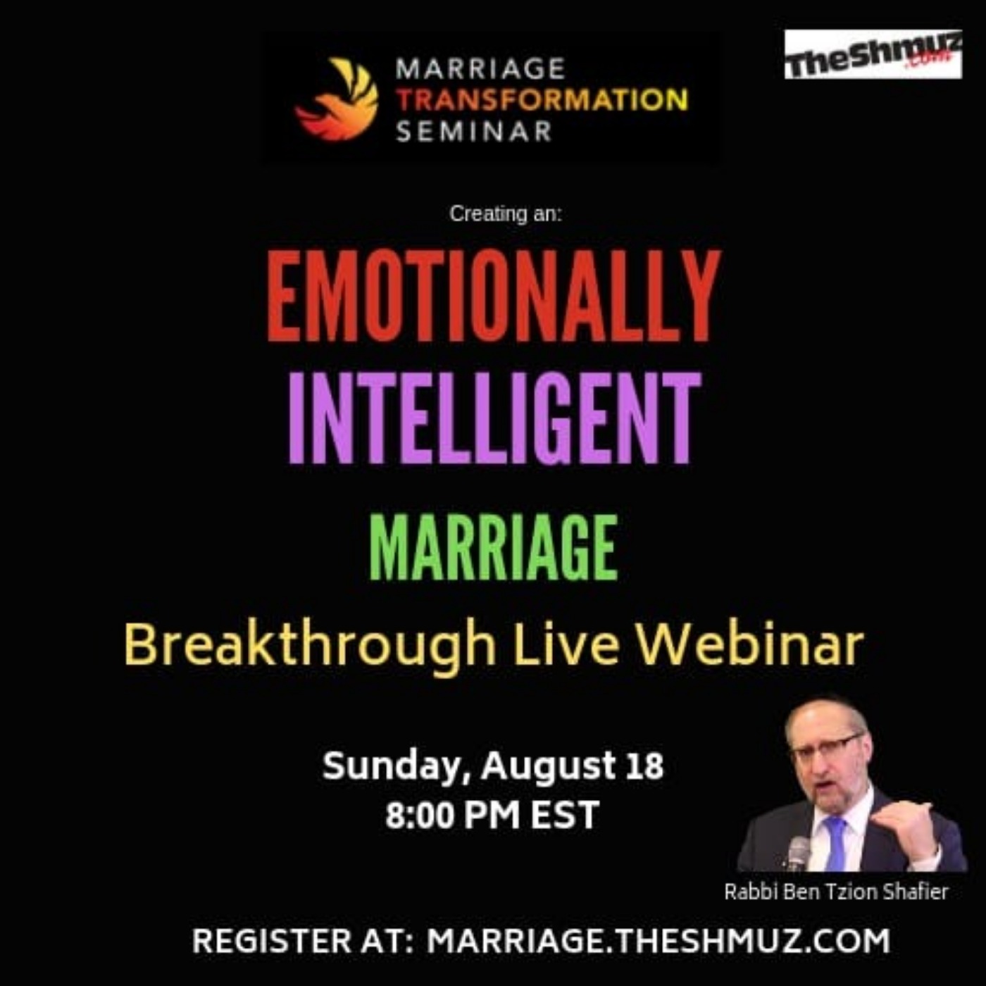 CLICK HERE TO LEARN MORE About the Marriage Transformation SeminarThe MARRIAGE TRANSFORMATION SEMINAR will:Help you reconnect to your spouse and rekindle the passion in your relationship.Stop the fighting, bickering and feeling lonely in your marriageLearn to be EMOTIONALLY INTELLIGENT and create a harmonious loving marriage.Rabbi Shafier’s Marriage Transformation Seminar will give you a clear, proven system to improve your marriage. It’s the only marriage program out there that offers the consistent, personal guidance from a trusted Torah authority, endorsed by leading marriage therapists and Rabbonim.This breakthrough Seminar will allow you to rediscover love, connection and friendship-even if your spouse refuses to change. Join other growth-orientated couples who have deepened their bond of love through the Marriage Transformation Seminar and have the marriage you have always dreamed of.Register at: MARRIAGE.THESHMUZ.COM See acast.com/privacy for privacy and opt-out information. This podcast has been graciously sponsored by JewishPodcasts.fm. There is much overhead to maintain this service so please help us continue our goal of helping Jewish lecturers become podcasters and support us with a donation: https://thechesedfund.com/jewishpodcasts/donate