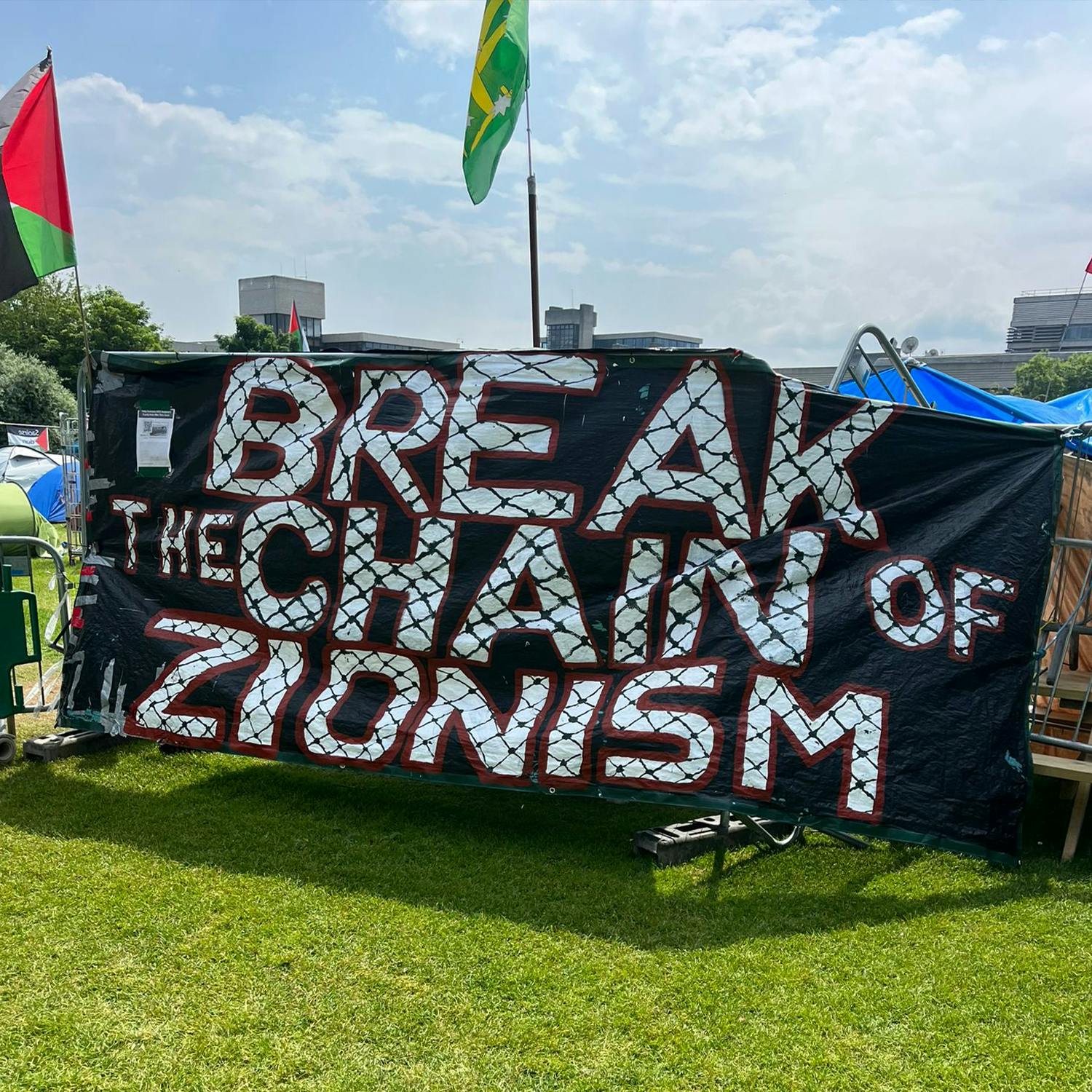 Outside the O'Reilly Hall is an encampment protest of about 100 tents organised by the students of UCD, showing solidarity to Gaza.