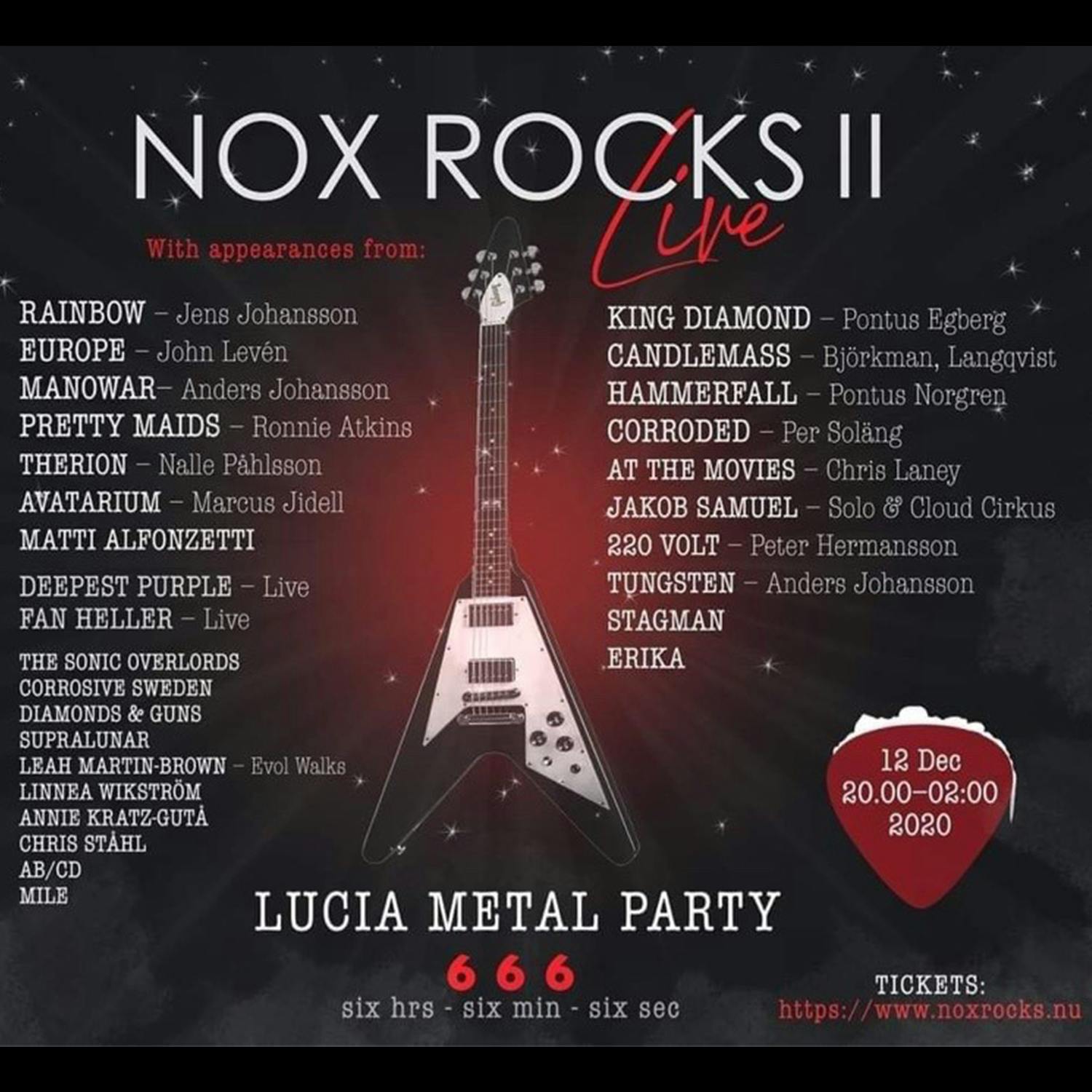 Det är Nox Rocks som åter igen drar ihop en massa kända rockartister under en streamad konsert som denna gång skall hålla på i 6 timmar 6 minuter och 6 sekunder. Hör mer om vilka häftiga och exklusiva konstellationer du har möjligheten att se på lördag.