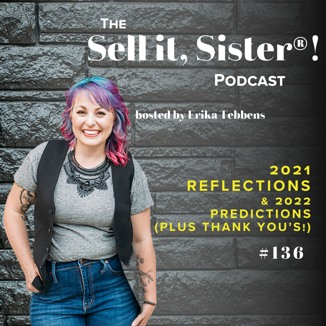 In this 2021 recap I share some of the highs, a lot of the deep soul searching work I did and revelations that came out of it, and some marketing predictions for 2022. This is probably the most real, raw, and fire-y episode I've ever recorded. Honestly, some long time listeners might be upset with what I have to say, but I'm ok with that. Because this episode shares my journey of revisiting my truth, what I uncovered, checking in with my values and mission, and choosing the direction I want to take going forward. It also includes thank yous to the many, many people who helped me and supported me in 2021. None of us succeeds alone! Thank you to my clients and listeners. I'd love it if you'd share my podcast with a friend so I can welcome more phenomenal people to the Sell it, Sister! community in 2022!