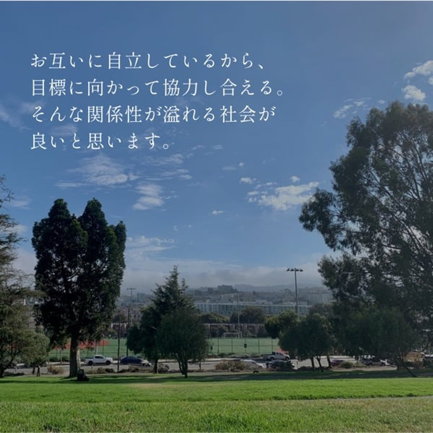 お互いに自立しているから目標に向かって強力し合える、そんな関係性が溢れる社会が良いと思います