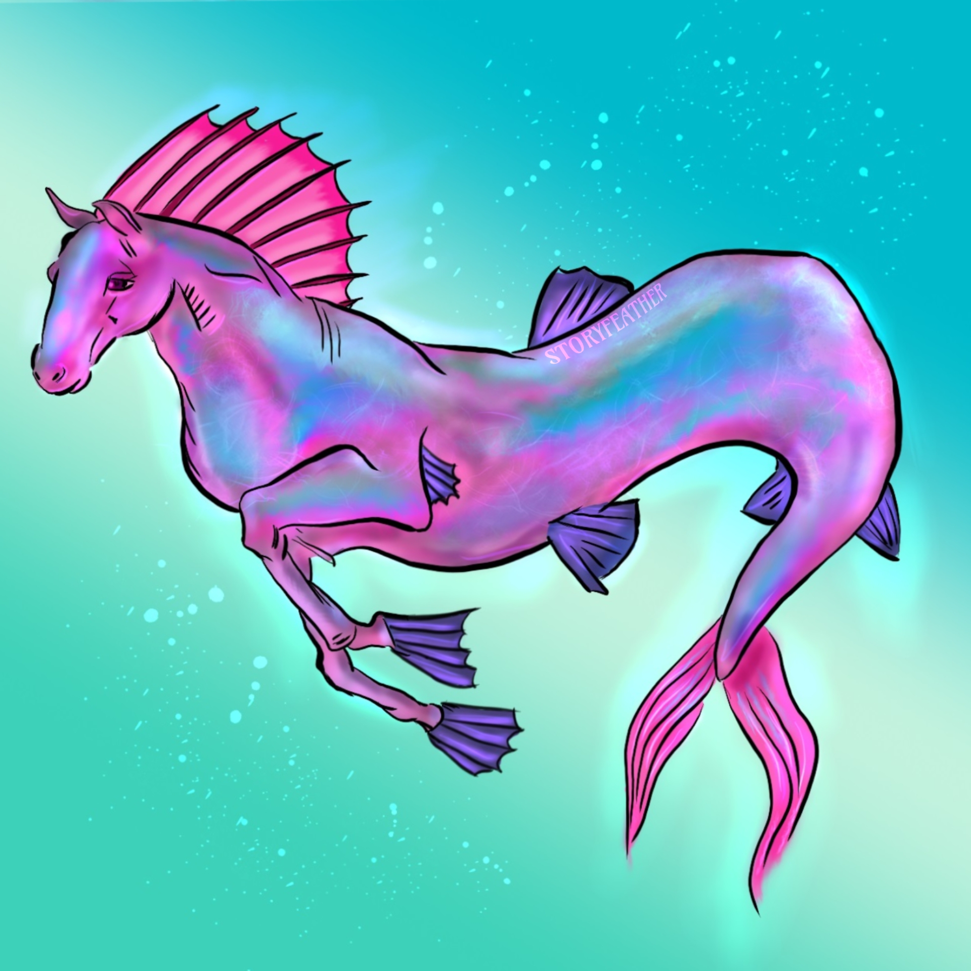 Digital drawing. Floating in water among small bubbles, the mythical creature known as the hippocampus. Seen from left side, the front half looks like a horse, except that the mane is replaced with a spiny dorsal fin, and the hooves are replaced by fins. The forelimbs appear to be in mid-gallop. The back half appears like a fish with fins protruding from the sides. The tail arcs toward the front. The creature's coloring is vivid and shimmering like a fish. Watermark of "Storyfeather" along middle of back.
