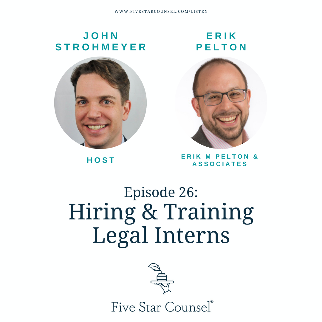 Legal interns offer much more value than low-cost back-office labor. They can also be the future of your firm. Giving interns a well-rounded experience isn't just good for the student, but can create consistent client experiences and trustworthy associates that understand your firm's process and clientele. IP attorney Erik Pelton joins us to discuss his excellent approach to intern hiring and training. Stick around for some killer tips on the filtering & application process!