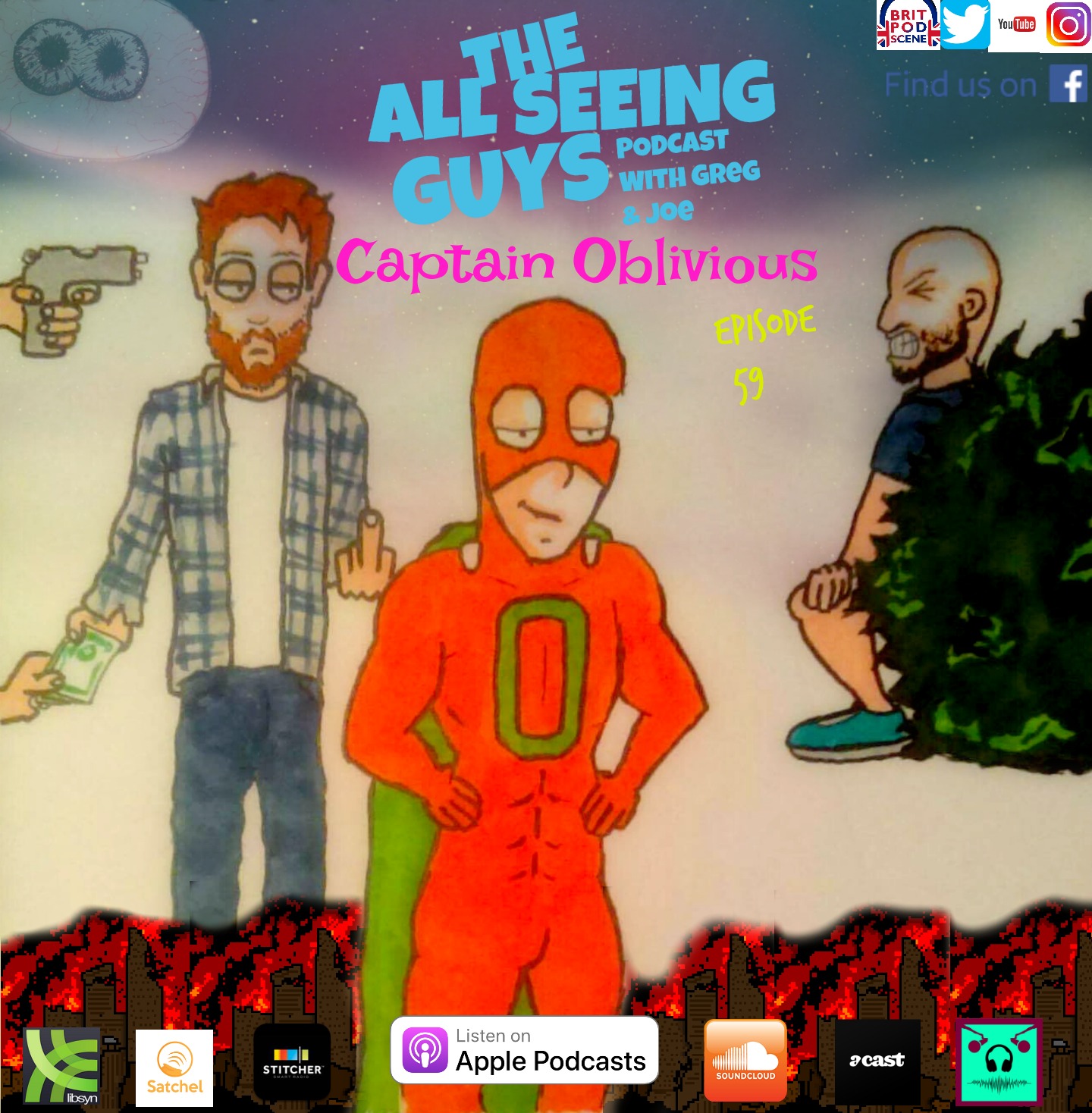 Welcome to episode 59 of The All Seeing Guys Podcast, this week the guys go unplanned & see where the conversation takes them & as expected it takes us to some weird places, mainly sharing stories of bizarre interactions we have had with strangers. Greg shares the story of when a stranger threw up on to his dick & some of the encounters he's had out on his runs, Joe pitches his new movie/TV show idea, a retirement home for super heroes & villains. The guys also invent the worlds most useless super hero.... Captain Oblivious.