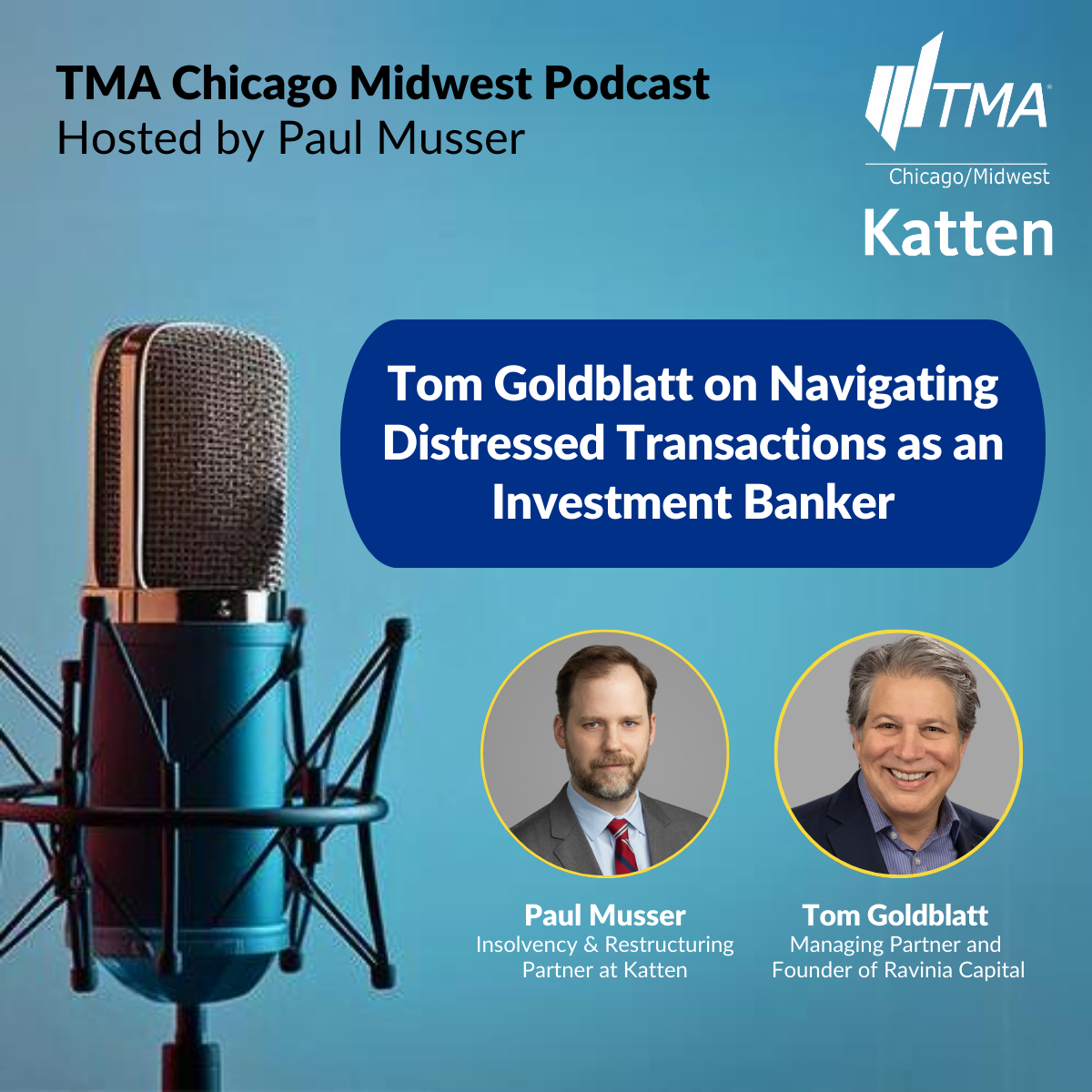 In this episode of the TMA Chicago/Midwest podcast, Managing Partner and Founder of Ravinia Capital Tom Goldblatt sits down with host Paul Musser to discuss the intricacies of the role of investment bankers in navigating distressed sales and refinancing processes. Tom, among other things, shares insights on the importance of establishing a structured process and the strategic use of stalking horse bidders. Their conversation also highlights the recent Roti Mediterranean sale that Tom worked on, illustrating the challenges and successes in such distressed transactions. Additionally, Tom shares takeaways from his involvement in the Turnaround Management Association (TMA), considerations for marketing oneself, and the benefits of networking and developing meaningful relationships with industry peers.