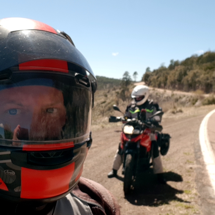 Meanwhile, Brian's reminiscing about New Mexico's bizarrely tenacious red clay, which somehow holds a tire's grip so long as you can see tarmac underneath. There's also the matter of polite cagers kindly pulling over before waving motorcyclists by. Riding the road that shall not be named, what planet is this?
