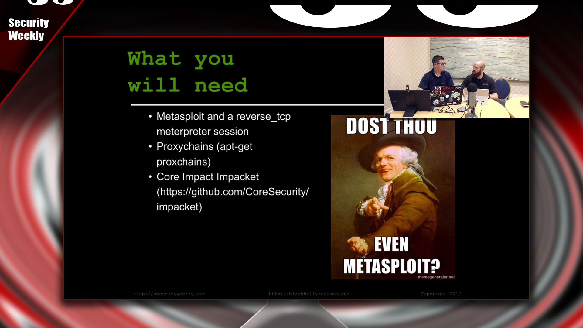 There are a ton of modules in Metasploit that are extremely useful for performing various attacks post-exploitation. But sometimes there are external tools that you might want to use that are not included in Metasploit. It's possible to proxy other external tools through a Meterpreter session using a module in Metasploit and proxychains. In this episode Derek Banks (@0xderuke) and Beau Bullock (@dafthack) talk about how to pivot external tools through Meterpreter sessions and demo how to dump Kerberos tickets using this method.