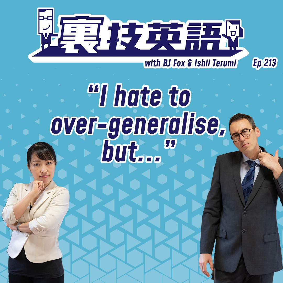 一般論に対して「もちろん、一概には言えないですけどね」とついフォローする癖のあるTerumi…BJはモヤモヤしていたようです。もちろんマーケットを見たり議論したりするときに1人ひとりケースが異なることをいちいち取り上げていたらキリが無いのでsweeping statement(一般論的発言)で語る必要があります。ただ、ステレオタイプで物事を断言するのは誰もが後ろめたくもあります。そこで紹介する裏技フレーズは"I hate to overgeneralize but"。一般論で話していると自覚していることが伝わるだけではなく、「でもこういう人もいますよ?」というpush backを防ぐ効果も!