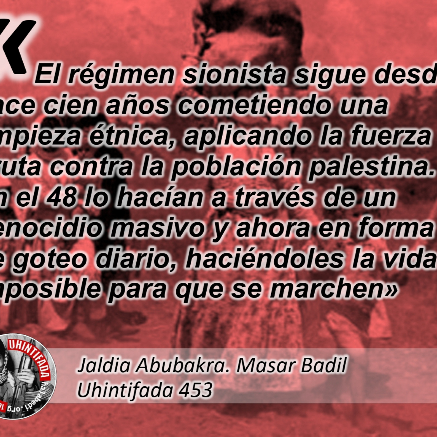 Martxoaren 30ean Palestinako Lurraren Eguna oroitzen da nazioarte mailan. Jardunaldi horretan 1976an erregimen sionistak Galilean burututako sarraskia ekartzen da gogora. Orduan, okupazio armadak burututako lurren lapurretaren kontra protestan ari ziren palestinarrak erasotu eta sei lagun erail zituen Palestina Historikoko eskualde horretan. Urteurren honen harira, diasporako palestinarren bizipena ekarri nahi izan dugu irratsaiora, urruntasunetik familiaren jaioterrira bueltatzeko eskubidearen aldarrikapenari eusten diotenena, alegia. Horixe da gure gaurko gonbiatueren kasua. Jaldia Abubakra Masar Badil (Palestinako Ibilbide Iraultzaile Alternatiborako Mugimendua) mugimenduko kidea da eta Gazan jaio zen, jaioterria 48an okupatuetako eremuetako Beerseba herrian zuen familia errefuxiatu baten baitan.