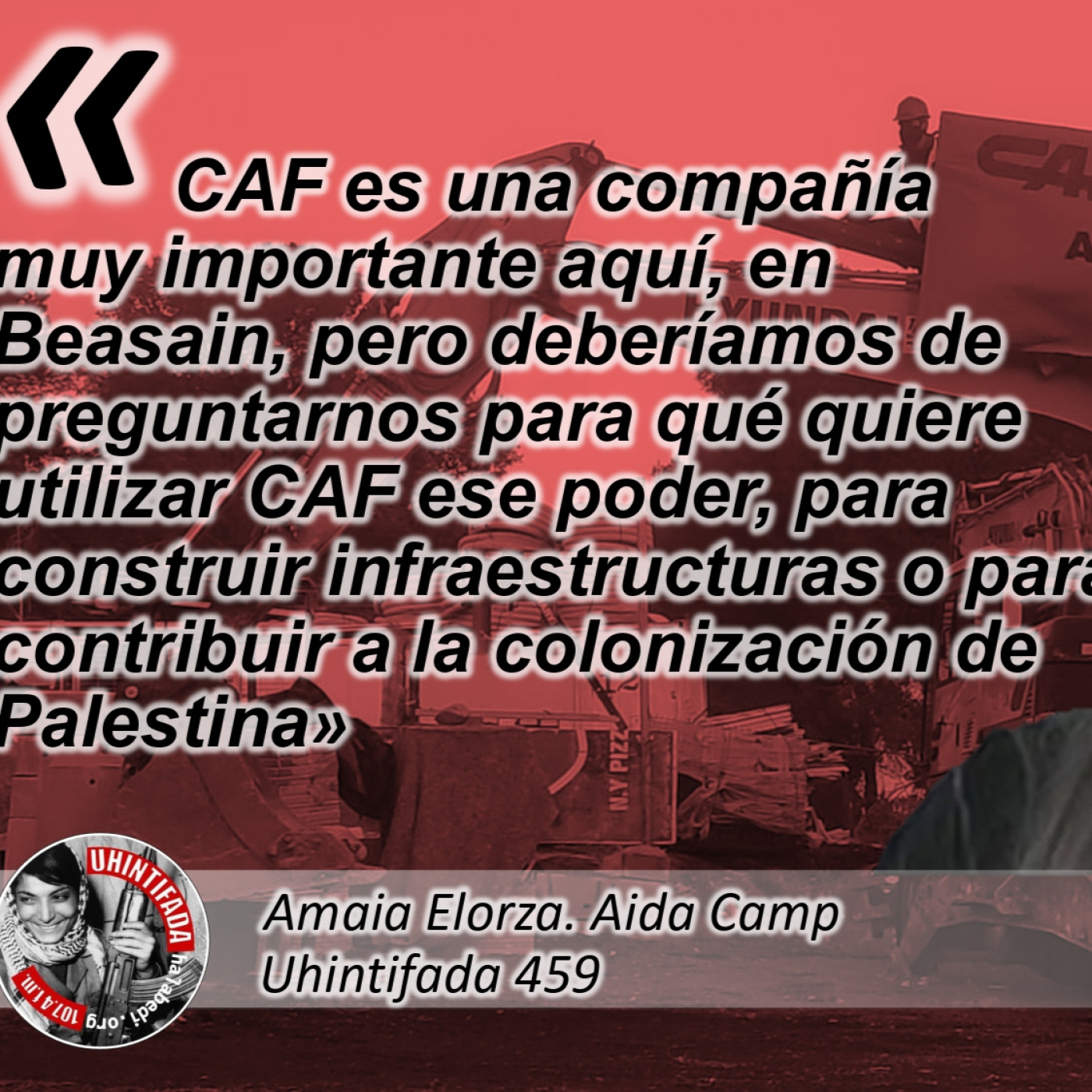 Datorren ekainaren 10ean CAF trengintza konpainiak urteroko Akziodunen Batzar Orokorra antolatu du bere Beasaingo egoitzan. Espero liteke topagune hori foro egokia izatea enpresako zuzendaritzak azalpenak eman ziezaien akziodun eta inbertsiogileei nazioarte mailan eskuartean darabiltzan proiektuen inguruan; besteak beste; nazioarteko legedia urratuz, eta okupaziopeko eremuetan zehar, konpainia gipuzkoarra Jerusalem Ekialdearen eta Jerusalemeko hirigunearen artean eraikitzen ari den tranbia linearen inguruan. Baina, zantzu guztien arabera, beste behin ere, seguruenik, ezikusiarena egingo dute etxeko korridorean duten elefantearen aurrean. 2019an Israelgo administrazioak eremu palestinarrean ilegalki okupatutako koloniak azpiegitura egonkor batez hornitzeko proiektuaren kontratua esleitu zien CAFek eta Shapir konapinia israeldarrak osatutako patzuergoari, proiektua nazioarteko zuzenbidearen kontrakoa bada ere. Gogoratu behar da Shapir, CAFen bazkidea, NBEren zerrenda beltzean dagoela, Palestinako okupazioarekin aberasten den enpresetako bat delako. Proiektu polemiko horretarako lehiaketan parte hartzekoak ziren beste nazioarteko enpresa guztiak erretitratutakoan, CAFek eskuratu zuen kontratua, eta seguruenik horretan parte hartzeak etekin oparoak ekarriko dizkie, epe laburrean, konpainiako zuzendariei; baina epe luzean kalte handia egingo dio enpresaren irudi korporatiboari. Izan ere, dagoeneko nazioarteko merkatuetan jomugan zituzten hainbat kontratuetako parte hartzea kolokan dago. Kontu honetaz hitz egiteko Amaia Elorza abokatu beasaindarra gonbidatu dugu Uhintifadako mikrofonootara. Elorza sei urte luzez aritu da Palestinan bizitzen eta lanean, hain zuzen ere, Bethlehem eskualdeko Aida errefuxiatuen kanpamenduan. Orain, berriz, Beasainen bizi da, txanponaren ifrentzuan, kolonizazioaren azpiegiturak eraikitzen ari den konpainia hain errotuta dagoen eskualdean.