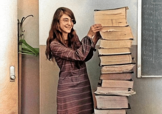 Pictured is Margret Hamilton standing beside the codes she and her team created for the historic Apollo 11 moon landing. (Photo Credit: World of History, @UmarBzv)