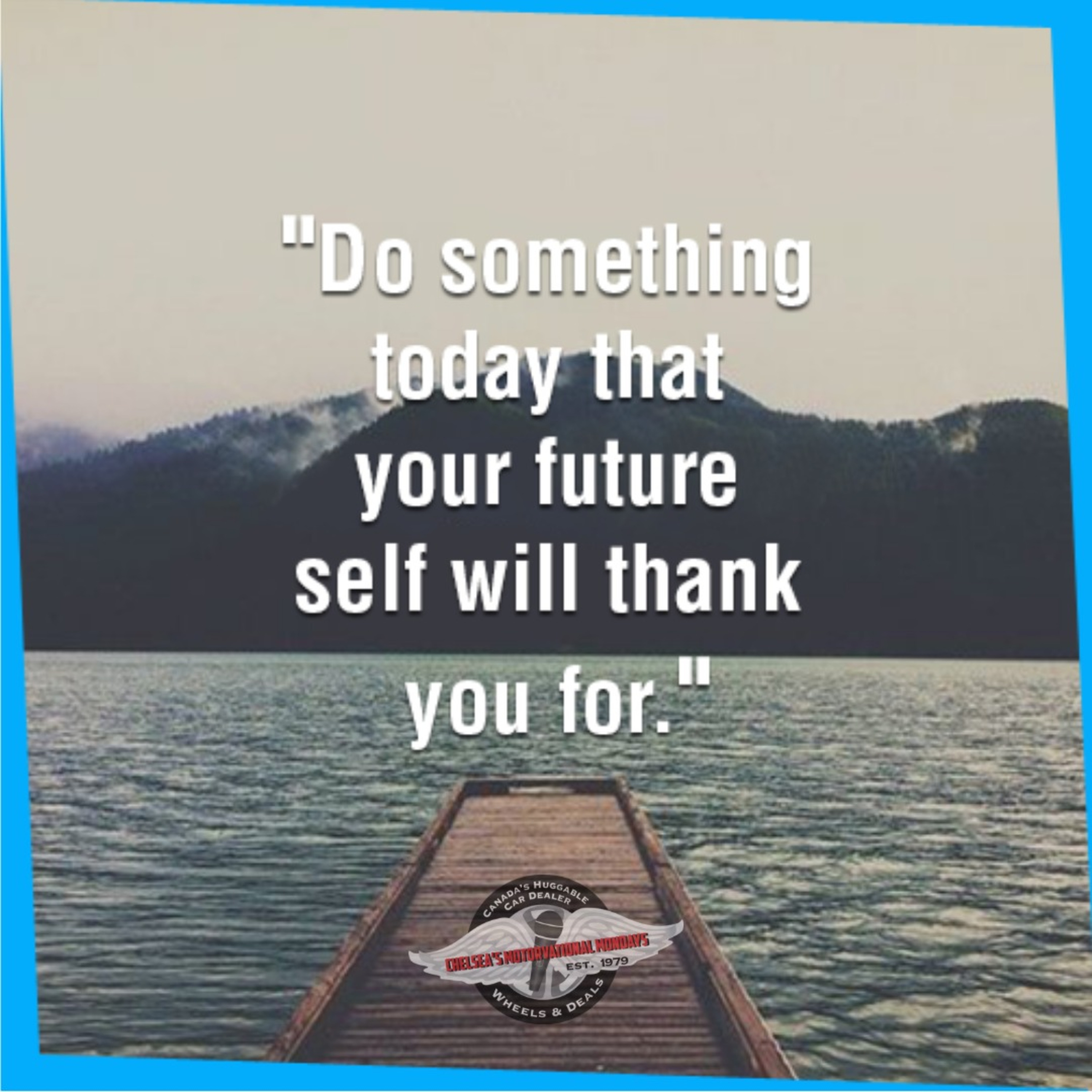 Chelsea's Motorvational Mondays. The thought of the day is "Please your future self." What I mean when I'm say about please your future self is think of yourself in the future. If you commit to going to lunch with someone, you show up that day. But yet you may commit to doing dishes, but you don't stay out five minutes later, do them, and then future you has a dirty kitchen. Whether it's just making your bed in the morning, doing the little bit of dishes, or going to the gym when you commit to it, is please your future self. Don't eat that meal because the future you is not going to feel good. So as you're going about your day this week, just think about what are you doing right now and is that pleasing your future self. We are always so concerned with pleasing other people. Every now and then it's nice to just put you first and everything you do, put to please your future self. So I hope we motivated you today to think about you in the future and keep yourself in mind. Have a Huggable Day.