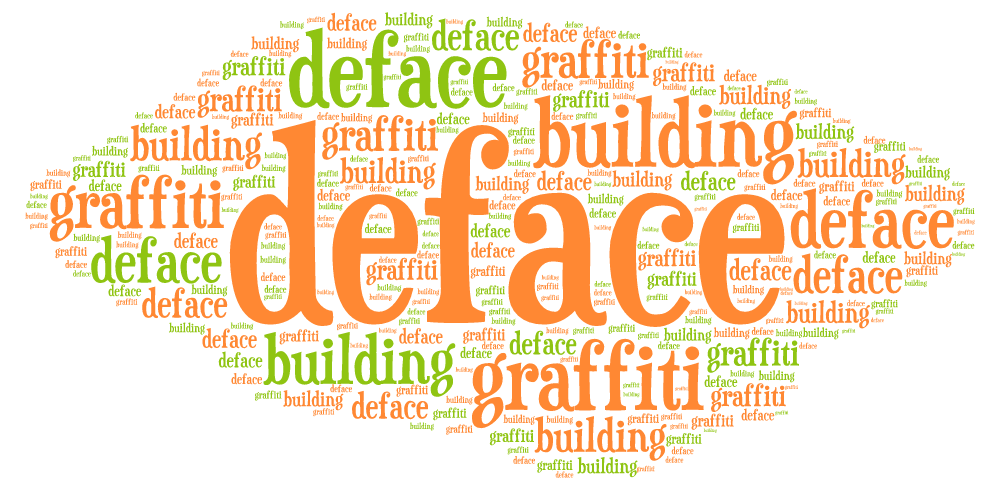 Stellen Sie sich vor, dass ein Gebäude ein Gesicht hat. Durch das Aufsprühen von Graffiti wird dem Gebäude das Gesicht genommen. Sagen Sie jetzt noch einmal laut den Beispielsatz: The building was defaced with graffiti.