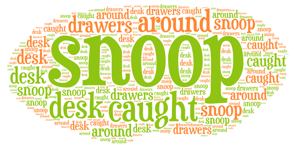Stellen Sie sich vor, wie der Hund Snoopy in Ihren Schreibtischschubladen herumschnüffelt und sagen dann noch einmal den Beispielsatz: I caught him snooping around in my desk drawers.