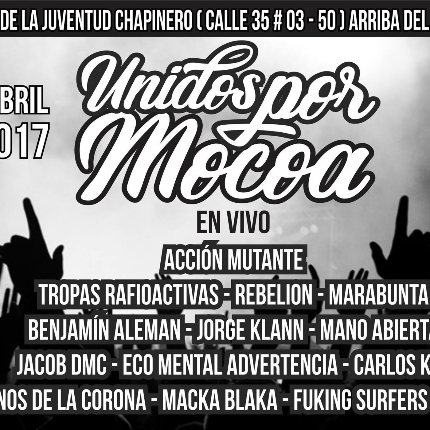 l movimiento artístico Bogotano, se ha unido en solidaridad con los Damnificados de Mocoa. Por esta razón se está invitando a Un concierto solidario que se llevara a cabo el día 09 de abril del 2017, en la casa de la juventud de chapinero. Ubicada en la calle 35 N 03-50, arriba del parque Nacional. El ingreso será una ayuda en especie, Alimento no perecedero, Ropa de clima cálido, colchonetas, carpas, plásticos, cuerdas, herramientas, elementos de ase básico, botiquín, NO medicamentos. Las agrupaciones que se presentaran son: (los del cartel) la programación inicia a partir de las 12:00 pm, pero las donaciones se recibirán desde la 10 am. Favor llevar sus donaciones embolsadas o empacadas.