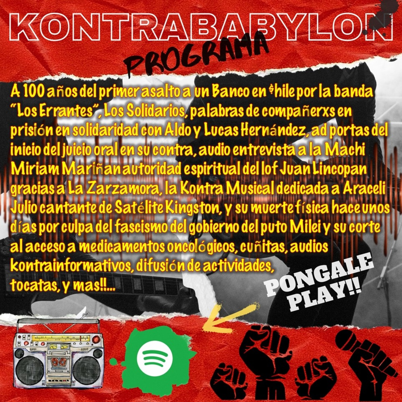 A 100 años del primer asalto a un Banco en $hile por la banda “Los Errantes”, Los Solidarios, palabras de compañerxs en prisión en solidaridad con Aldo y Lucas Hernández, ad portas del inicio del juicio oral en su contra, audio entrevista a la Machi Miriam Mariñan autoridad espiritual del lof Juan Lincopan gracias a La Zarzamora, la Kontra Musical dedicada a Araceli Julio cantante de Satélite Kingston, y su muerte física hace unos días por culpa del fascismo del gobierno del puto Milei y su corte al acceso a medicamentos oncológicos, cuñitas, audios kontrainformativos, difusión de actividades,