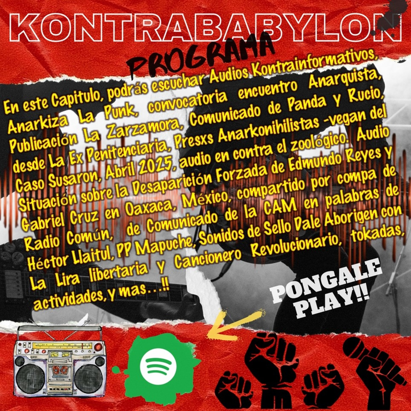 En este Capitulo, podrás escuchar Audios Kontrainformativos, Anarkiza La Punk, convocatoria encuentro Anarquista, Publicación La Zarzamora, Comunicado de Panda y Rucio, desde La Ex Penitenciaria, Presxs Anarkonihilistas -vegan del Caso Susaron, Abril 2025, audio en contra el zoológico. Audio Situación sobre la Desaparición Forzada de Edmundo Reyes y Gabriel Cruz en Oaxaca, México, compartido por compa de Radio Común, de Comunicado de la CAM en palabras de Héctor Llaitul, PP Mapuche, Sonidos de Sello Dale Aborigen con La Lira libertaria y Cancionero Revolucionario, tokadas, actividades, y mas…!!