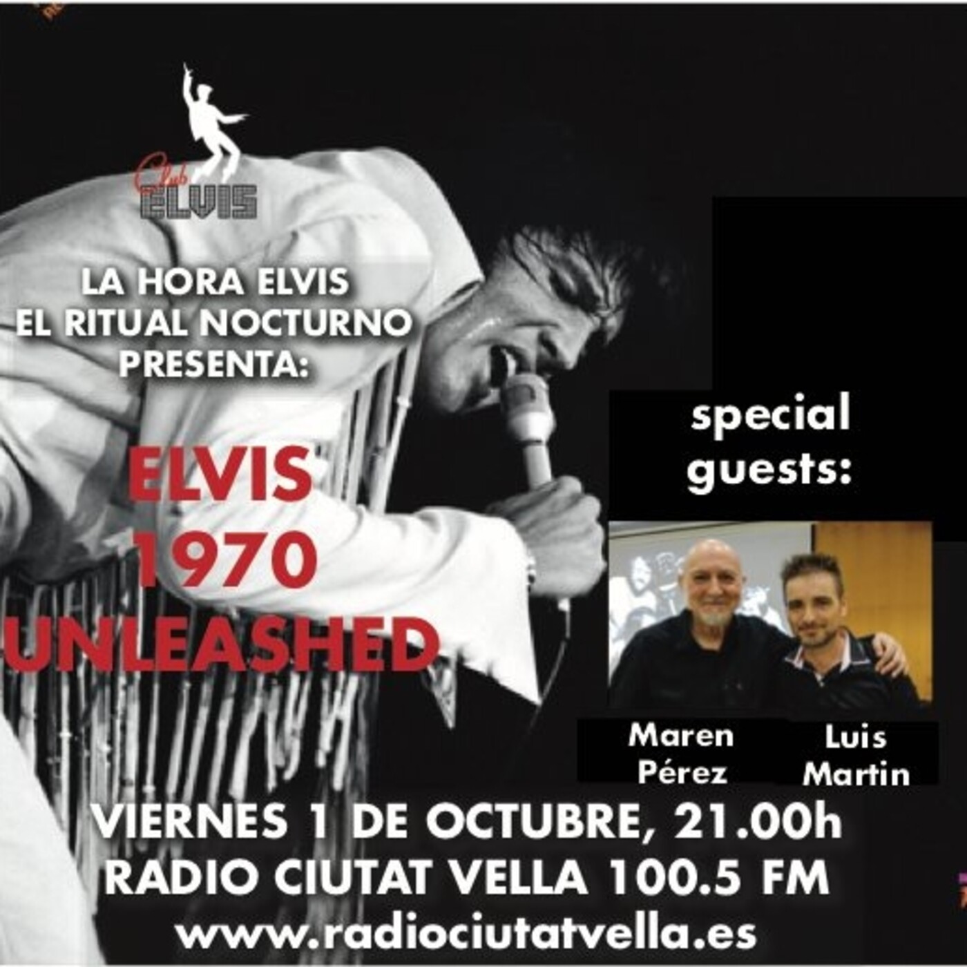 Pero además, contamos en el estudio con la presencia de dos grandes músicos que llevan más de 15 años realizando tributo a Elvis, como son Maren Perez y Luis Martin Sanchez, a los que, aparte de explicarnos sus futuros proyectos, escuchamos en directo en el estudio, en un programa una vez más presentado, y ya van más de 25 años, por Joaquin Luque.
