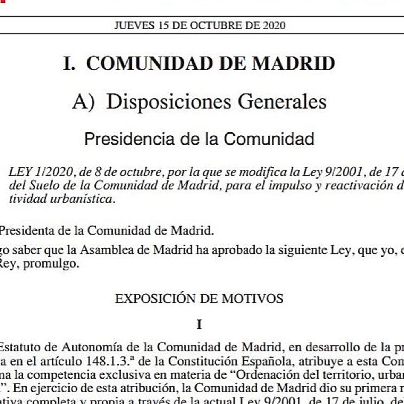 David Moreno, concejal de Urbanismo, resalta la importancia de la derogación de la Ordenanza de Actos Comunicados aprobada en el pleno de mayo. Esta es una consecuencia directa de la modificación de la Ley del Suelo de la Comunidad de Madrid, Ley 1/2020, de 8 de octubre, por la que se modifica la Ley 9/2001, de 17 de julio