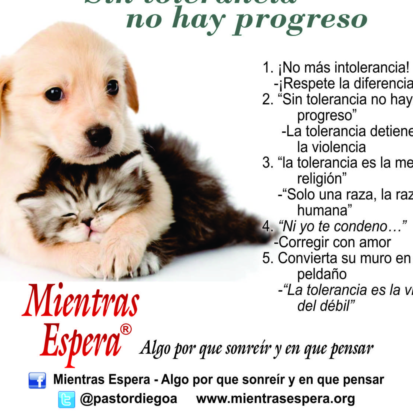 Tolerancia se refiere al respeto hacia las ideas, preferencias, formas de pensamiento o comportamientos de las demás personas. “La intolerancia se opone a la libertad de conciencia y termina deseando la inquisición.” Y he comprobado que los que persiguen la paz nunca se detienen ante los obstáculos especialmente los construidos de fanatismo, intolerancia, rigidez y tradición.