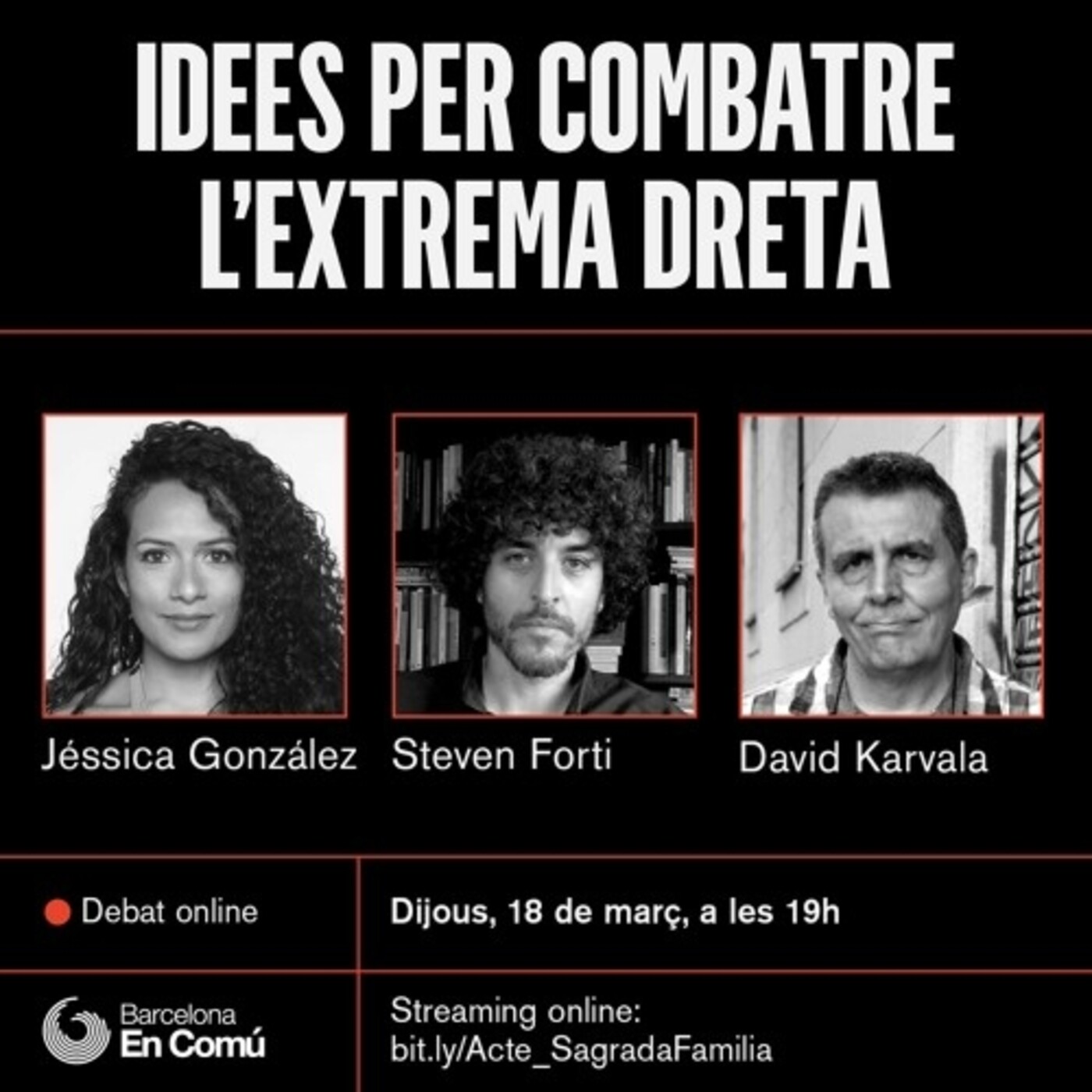 En moments de crisi i desafecció, l’ultradreta sempre troba la manera d’entrar en el debat. Com se li pot fer front? De quines eines disposem per combatre les seves idees racistes, xenòfobes i reaccionàries? En parlarem aquest dijous en un acte organitzat per l’Assemblea de Sagrada Família en el marc de les accions que s’estan desenvolupant a nivell internacional.nParticipants:nnJéssica González, diputada d’En Comú PodemnSteven Forti, investigador en Història ContemporànianDavid Karvala, activista de la UCFR