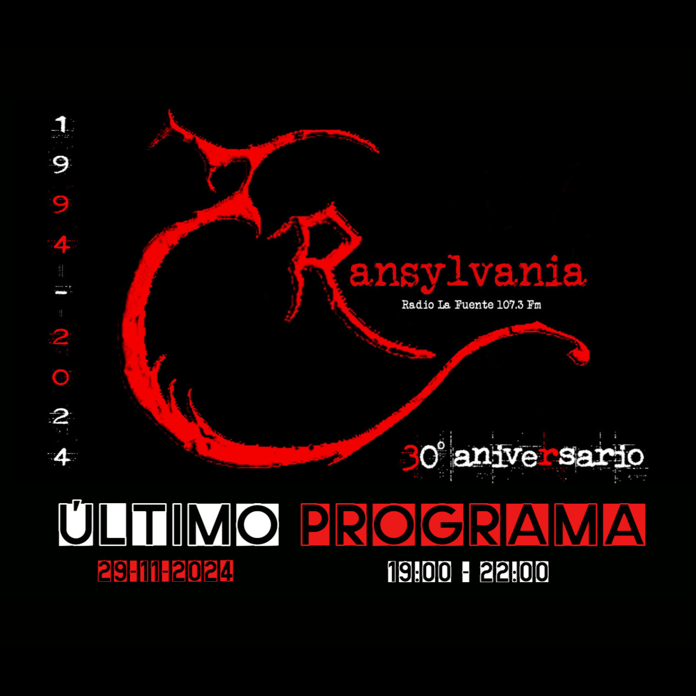 Último programa de la historia de Transylvania emitido el 29 noviembre 2024, tras 30 años 9 meses y 25 días. Entre otros sonaron: GARY MOORE, COZY POWELL, BLACK SABBATH, KISS, FLAMIN' GROOVIES, POKER DE BLUES, SKID ROW, CROSSBONE SKULLY, EDGUY, WIDOWMAKER, MERCYFUL FATE, LED ZEPPELIN, THE OFFSPRING, YOUTH OF TODAY, GRAVE DIGGER, FEAR FACTORY, MACHINE HEAD, LA VENGANZA DE LA ABUELA, NEGU GORRIAK, DEF CON DOS, BODY COUNT, PARADISE LOST, MY DYING BRIDE, DORO, GEDDY LEE y IRON MAIDEN.