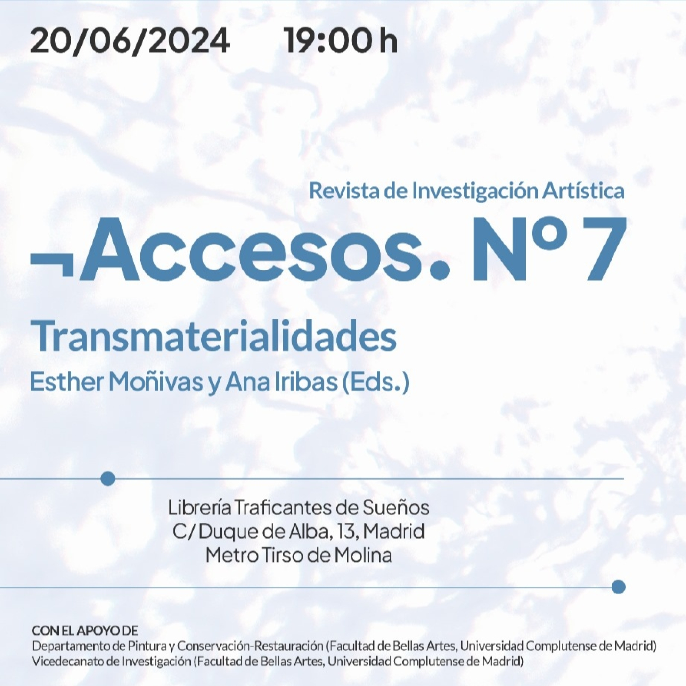 Revista de investigación artística. Con Esther Moñivas y Ana Iribas Rudín (Eds.). El número 7 de ¬Accesos. Revista de investigación artística se centra en las materialidades y los entrelazamientos materio-discursivos en las prácticas artísticas actuales. Este volumen articula un conjunto de reflexiones teóricas, prácticas artísticas y lecturas difractivas que rastrean intra-acciones en sistemas complejos y en dimensiones físicas, digitales, virtuales, corporales, políticas, emocionales, sensoriales, imaginativas y textuales de nuestro mundo actual.