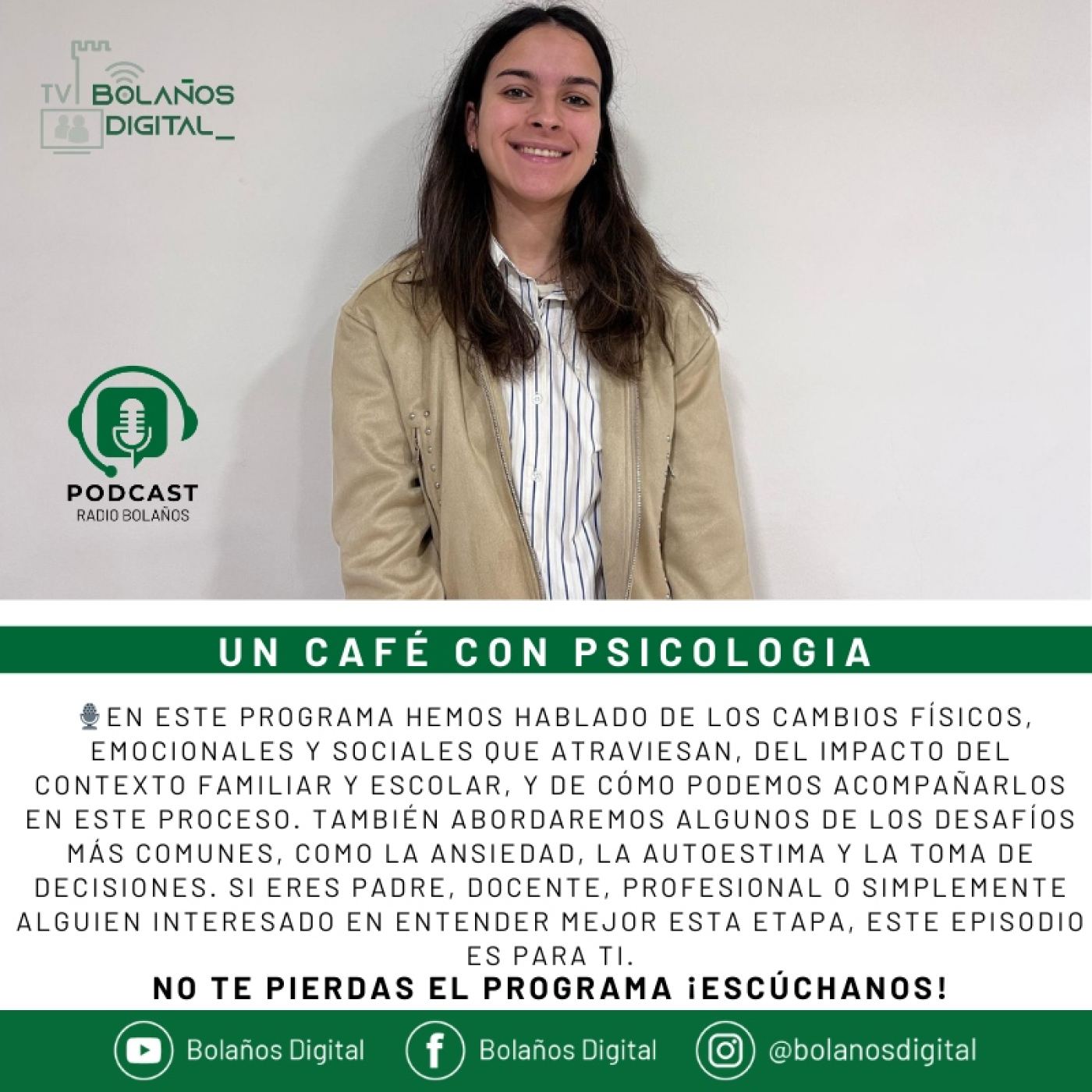 🎙️En este programa hemos hablado de los cambios físicos, emocionales y sociales que atraviesan, del impacto del contexto familiar y escolar, y de cómo podemos acompañarlos en este proceso. También abordaremos algunos de los desafíos más comunes, como la ansiedad, la autoestima y la toma de decisiones. Si eres padre, docente, profesional o simplemente alguien interesado en entender mejor esta etapa, este episodio es para ti.
