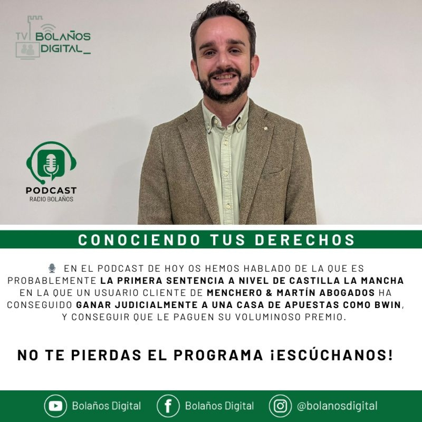 🎙️ En el PODCAST de hoy os hemos hablado de la que es probablemente la primera Sentencia a nivel de Castilla La Mancha en la que un usuario cliente de Menchero & Martín Abogados ha conseguido GANAR judicialmente a una casa de apuestas como BWIN, y conseguir que le paguen su voluminoso PREMIO.