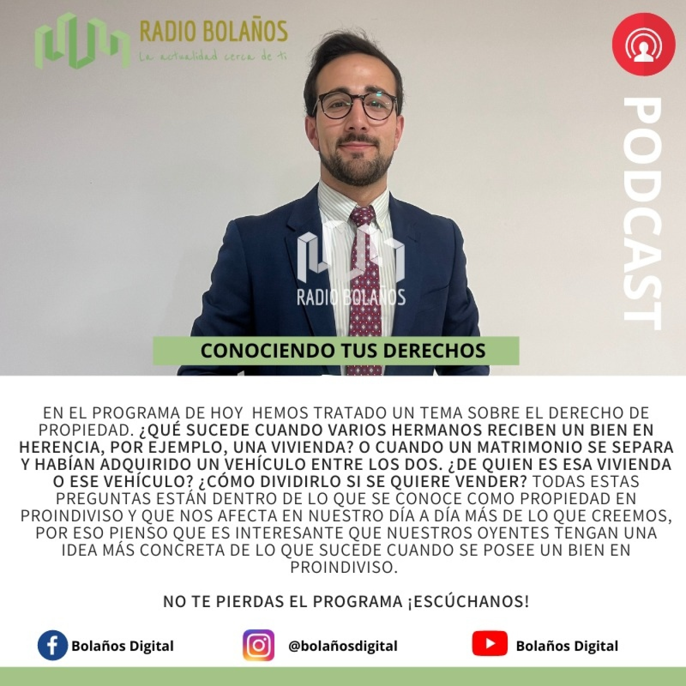 En el programa de hoy hemos tratado un tema sobre el derecho de propiedad. ¿Qué sucede cuando varios hermanos reciben un bien en herencia, por ejemplo, una vivienda? O cuando un matrimonio se separa y habían adquirido un vehículo entre los dos. ¿De quien es esa vivienda o ese vehículo? ¿Cómo dividirlo si se quiere vender? Todas estas preguntas están dentro de lo que se conoce como propiedad en proindiviso y que nos afecta en nuestro día a día más de lo que creemos, por eso pienso que es interesante que nuestros oyentes tengan una idea más concreta de lo que sucede cuando se posee un bien en proindiviso.