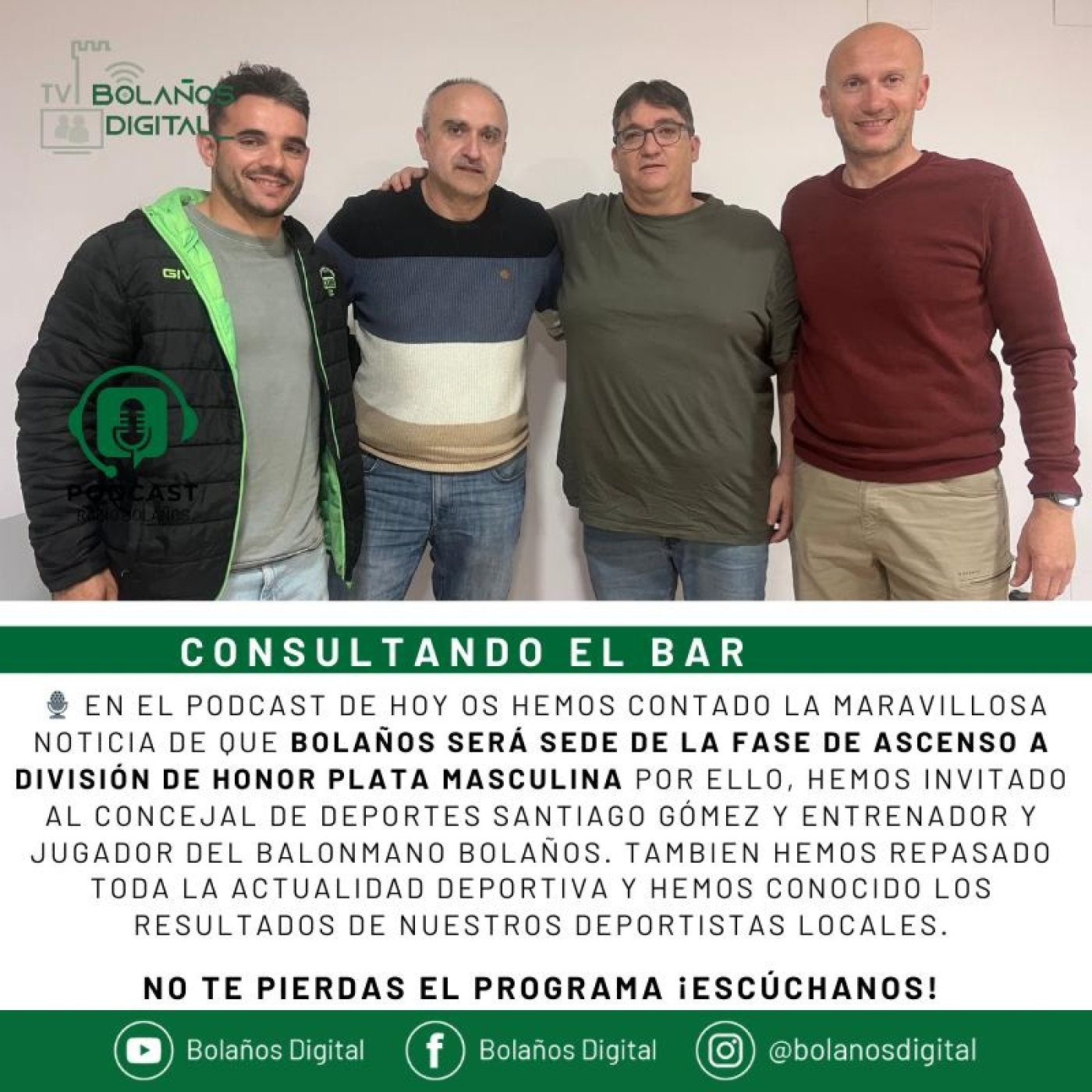 🎙️ EN EL PODCAST DE HOY OS HEMOS CONTADO LA MARAVILLOSA NOTICIA DE QUE BOLAÑOS será sede de la Fase de Ascenso a División de Honor Plata Masculina POR ELLO, HEMOS INVITADO AL CONCEJAL DE DEPORTES SANTIAGO GÓMEZ Y ENTRENADOR Y JUGADOR DEL BALONMANO BOLAÑOS. TAMBIEN HEMOS REPASADO TODA LA ACTUALIDAD DEPORTIVA Y HEMOS CONOCIDO LOS RESULTADOS DE NUESTROS DEPORTISTAS LOCALES.