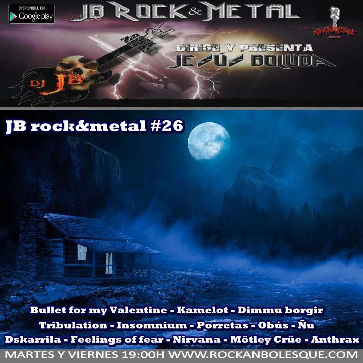 En el programa de esta semana hemos arrancado con Bullet for my Valentine, y su nuevo tema Over it. La sección internacional la han compuesto dos temas nuevos, de Kamelot (Phantom Divina - Shadow Empire) y de Dimmu Borgir (Council of wolves and snakes). También hemos tenido a Tribulation (The lament), Insomnium (While we sleep) y Trivium (Beyond Oblivion), estos tres porque están de conciertos este fin de semana en nuestro país. La sección nacional la han cubierto Porretas (Si lo sé me meo), Obús (Dinero dinero) y Ñu (Más duro que nunca), que están de gira. Hemos conocido a Dskarrila (Skapar) que hizo su puesta de largo el pasado Jueves, y hemos presentado, para quien no los conozca, a Feelings of fear (Alive), que hacen un metal gótico muy interesante. El rewind de esta semana ha correspondido a Nirvana (Come as you are), conmemorando la fecha del fallecimiento de Kurt Cobain, y hemos cerrado con Mötley Crüe (Girls, girls, girls) y Anthrax (The devil you know). ¡Salud, rock y muerte al reggaetón!