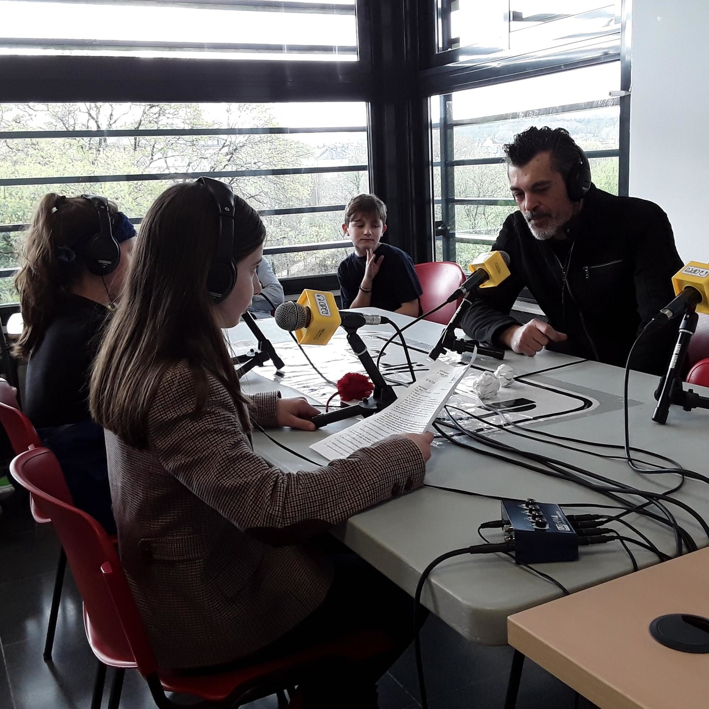 O alumnado do CEIP Plurilingüe do Camiño Inglés conversa con Xabier Deive, actor e padriño da III semana solidaria de teatro.