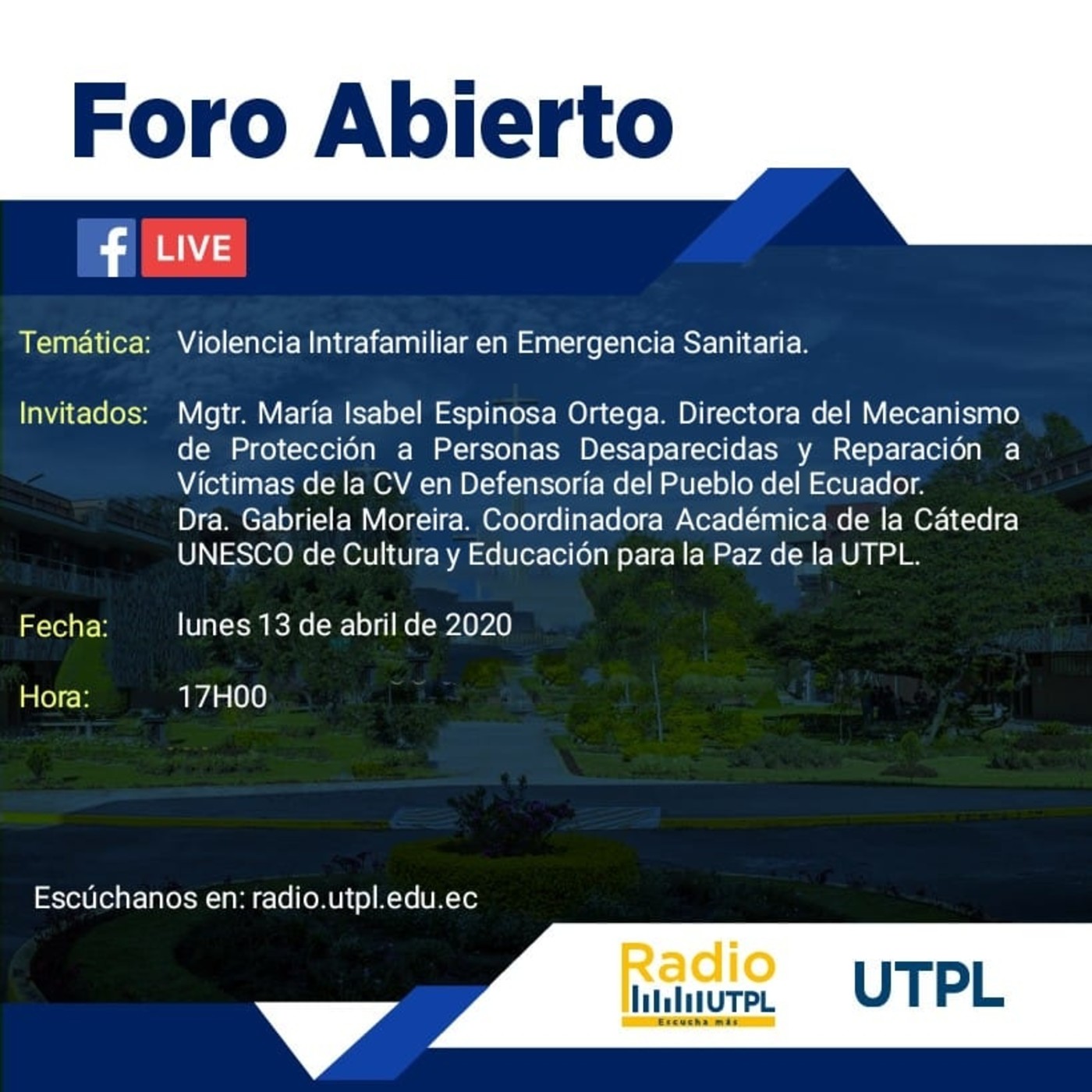 En nuestro segmento: “Foro Abierto” hablamos sobre Violencia Intrafamiliar en Emergencia Sanitaria junto a la Mgtr. María Isabel Espinosa Ortega, Directora del Mecanismo de Protección a Personas Desaprecidas y Reparación a Víctimas de la CV en Defensoría del Pueblo del Ecuador y Dra. Gabriela Moreira Aguirre: Coordinadora Académica de la Cátedra UNESCO de Cultura y Educación para la Paz de la UTPL.