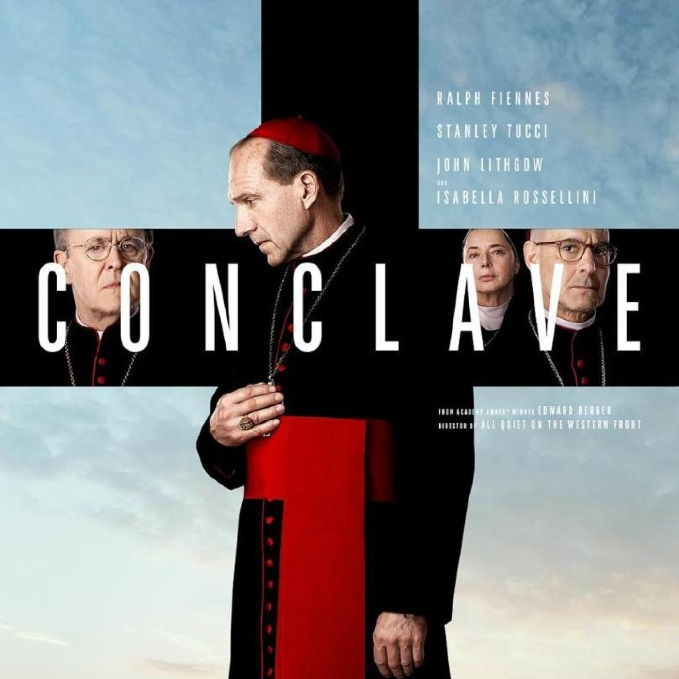 “Cónclave”. Película dirigida por Edward Berger y escrita por Peter Straughan, basada en la novela homónima de Robert Harris, publicada en 2016. El elenco principal está conformado por Ralph Fiennes, Stanley Tucci, John Lithgow, e Isabella Rossellini.