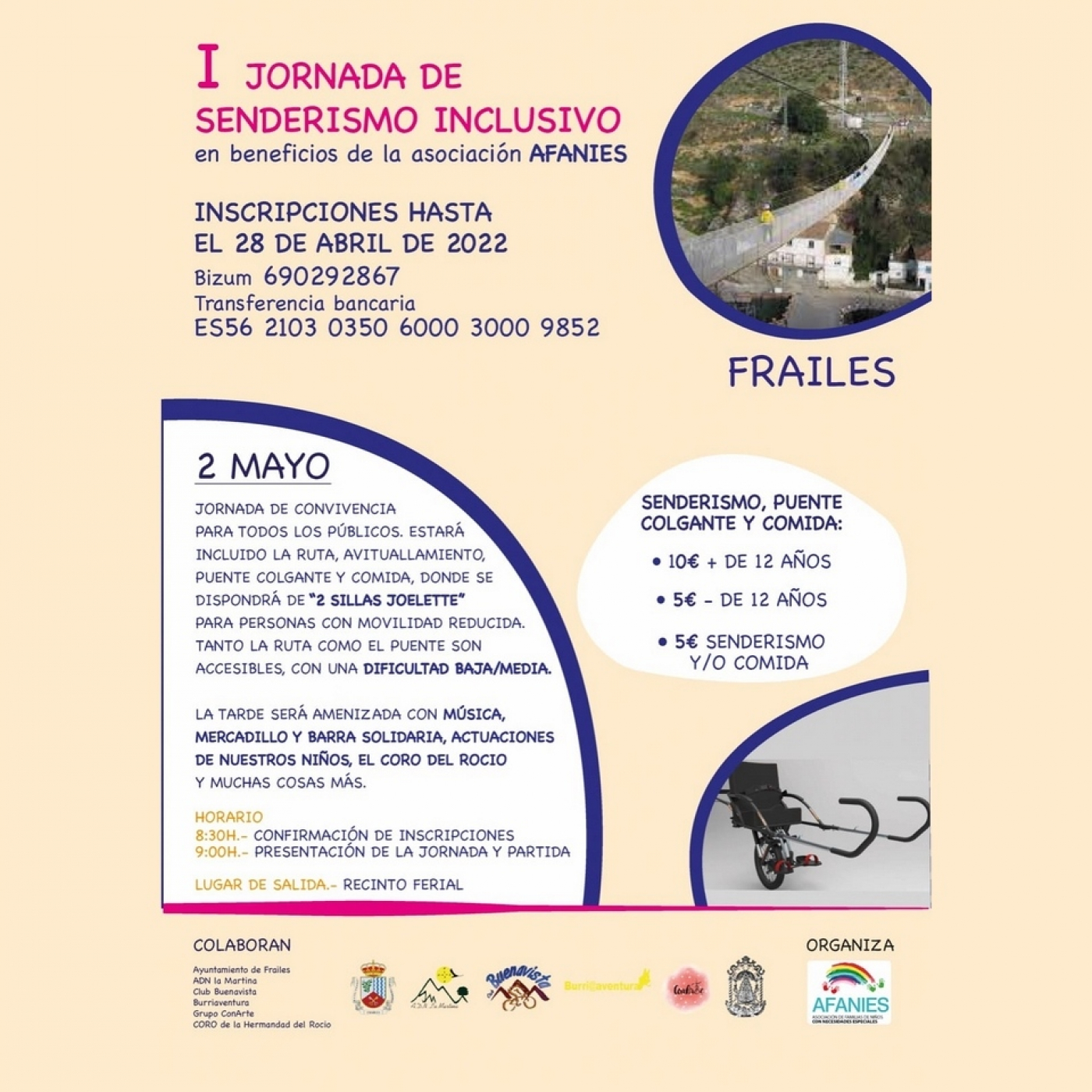 Las inscripciones se pueden realizar hasta mañana día de 28 de abril. Esta jornada de convivencia incluye ruta, avituallamiento,puente colgante y comida, donde se dispondrá de sillas especiales para personas con movilidad reducida. Tanto la ruta como el puente son accesibles, con una dificultad baja/media. Por la tarde habrá música, mercadillo y barra solidaria, actuaciones de los niños de Afaníes, el coro del rocío y muchas cosas más. Hoy con nosotros la nueva presidenta de AFANIES, María Victoria Aceituno.