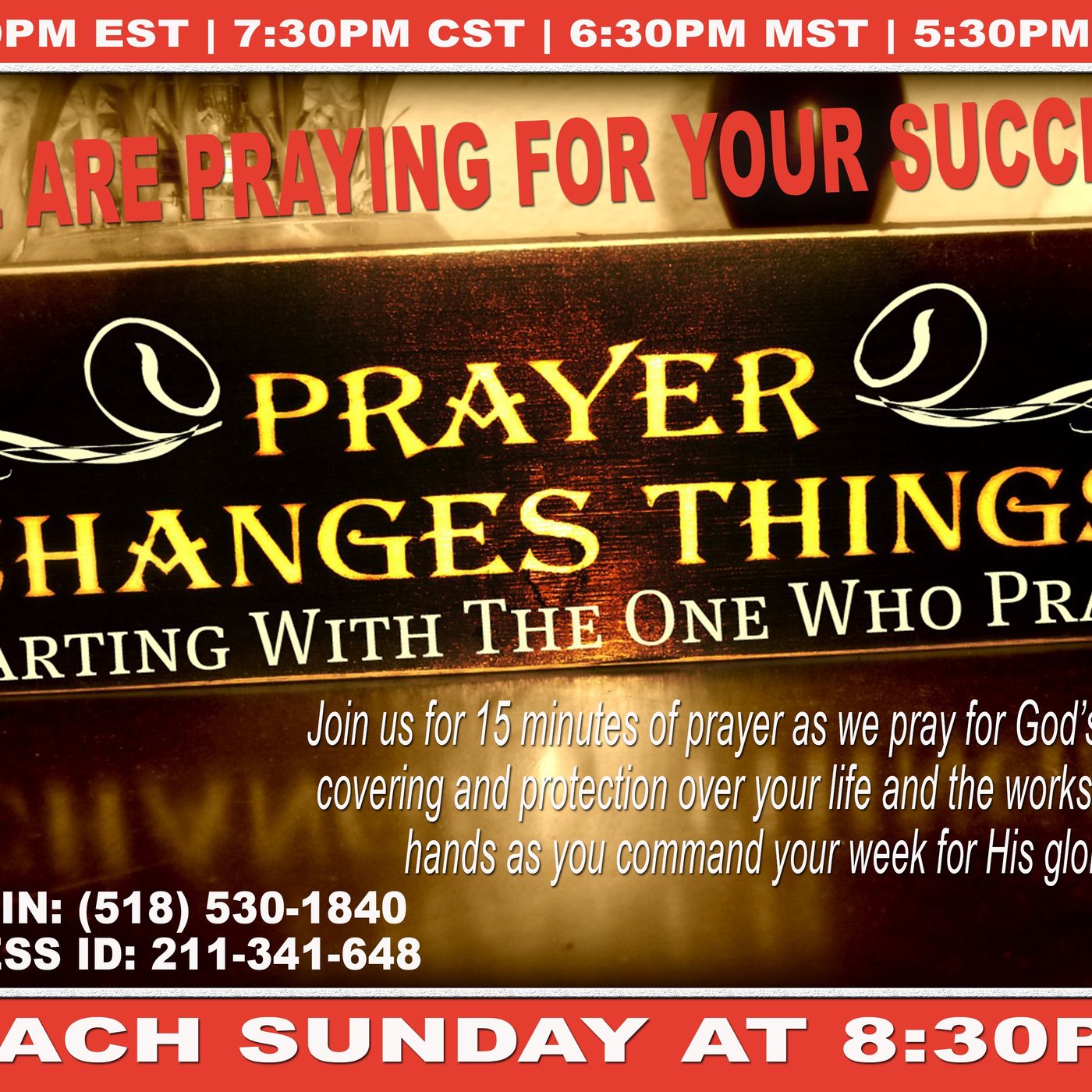 Intercessory Prayer with Jackie GuessJoin us each Sunday at 8:30pm - 8:45pm Dial in: (518) 530-1840Access ID: 211-341-648