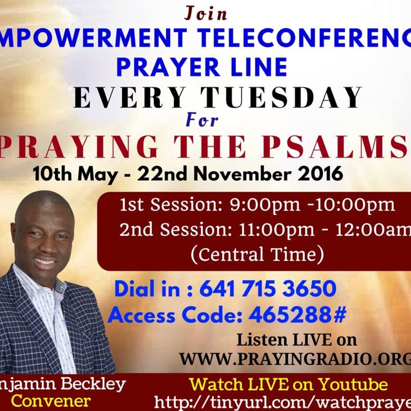 Join the Empowerment Teleconference Prophetic Prayers EVERY TUESDAY 1st Session: 9:00pm-10:00pm (Central Time) | 2nd Session : 11:00pm-12:00am (Central Time). Dial in - 6417153650. Access Code: 465288#.