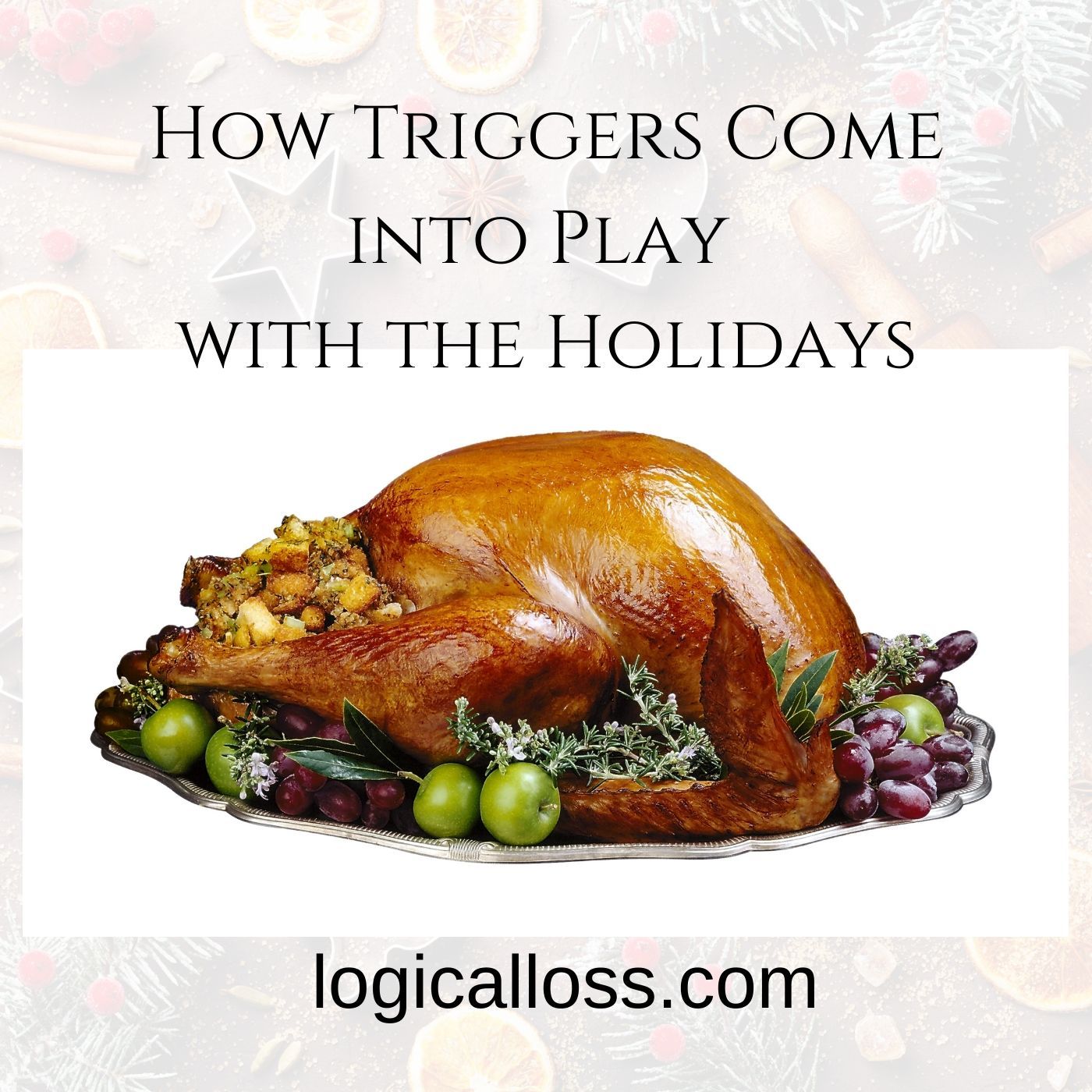 Weight update. November 5th I am at 226. November 19th 225. Different Types of Food Triggers Behavior Chains start with triggers: Environmental Biological Mental Emotional Social Triggers Produce Thoughts Thoughts Lead to Actions Actions lead to consequences Consequences Physical Psychological Physiological Emotional This example is from Noom Mentioned in This Episode 5 Ways to Battle the Holidays Noom Weight Loss App Join the Fitness Focused New Year