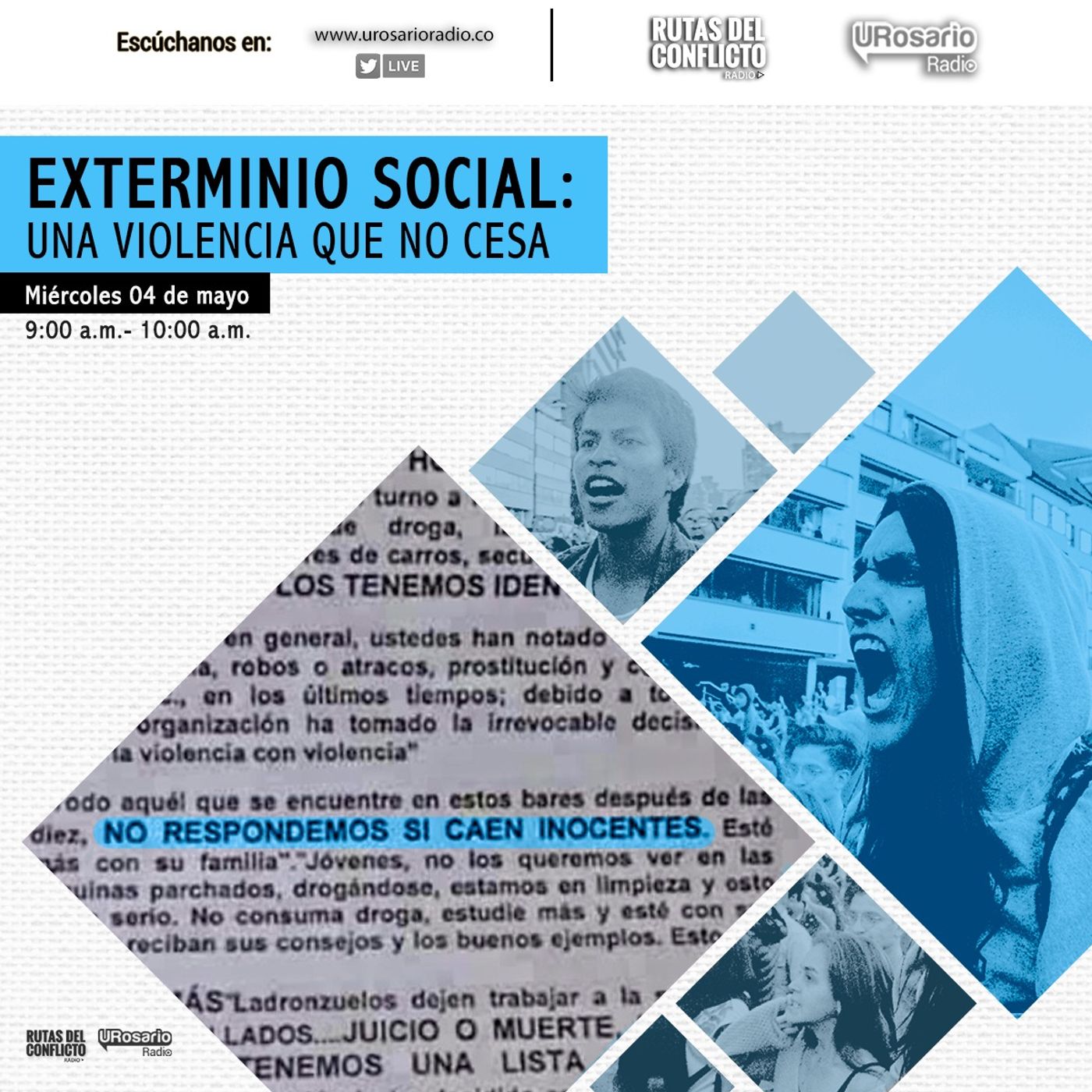 En Colombia, desde la década de los 70, a lo largo y ancho del país, pero especialmente en barrios periféricos, los grupos armados, especialmente paramilitares; muchas veces en colaboración de agentes del Estado, encontraron en el exterminio social, mal llamado "limpieza social", una forma de ejercer control territorial, asesinando a personas estigmatizadas como indeseables. Así mismo, el exterminio social también se ha usado con fines políticos. El exterminio social, entonces, no solo ha significado la muerte de jóvenes, personas LGBTI, habitantes de calle, trabajadoras sexuales, entre otras personas estigmatizadas, sino también de quienes han sido señaladas como militantes de izquierda y opositorales políticos. ¿Cómo la estigmatización, estrategia justificadora de la violencia, también ha repercutido en la doctrina de una fuerza pública que ha venido desatando brutalidad policial? ¿El discurso oficial que culpa a los manifestantes de vándalos o criminales puede ser en parte un reciclaje de esta misma estrategia de estigmatización? Escúchalo en este programa de Rutas del Conflicto Radio. Conducen Valeria Urán y Marcela Rios