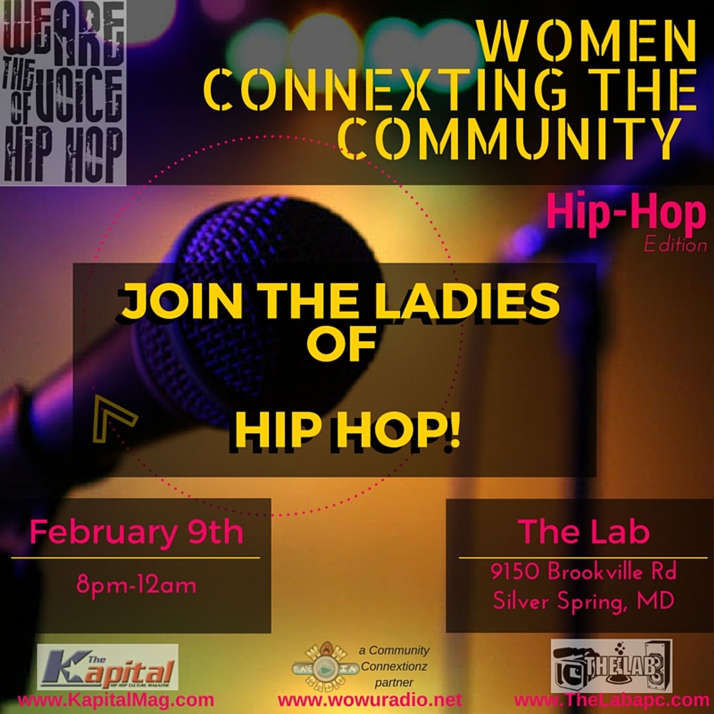 WCC HipHop edition events are a celebration of women in Hip Hop & the entertainment industry. The 1st event was held on February 9, 2016 at The Lab in Silver Spring, MD. This event included a female panel discussing various topics.