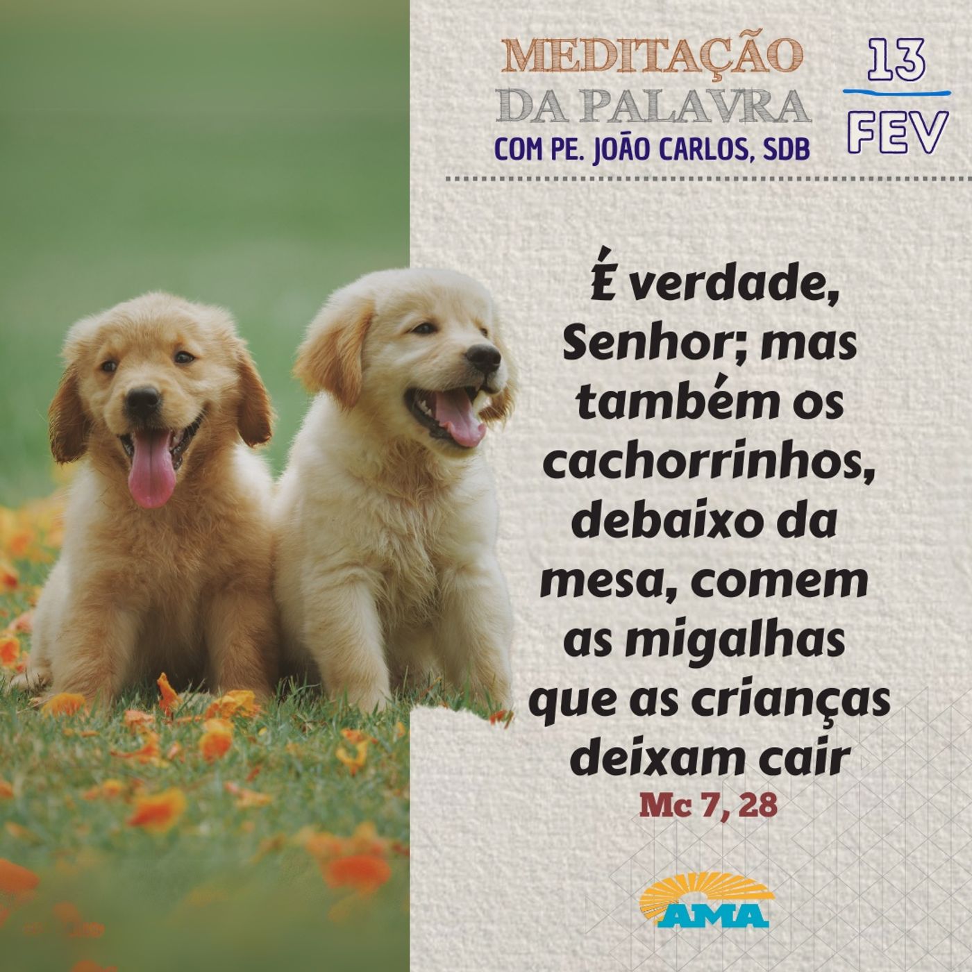 🐶. É verdade, Senhor; mas também os cachorrinhos, debaixo da mesa, comem as migalhas que as crianças deixam cair (Mc 7, 28)