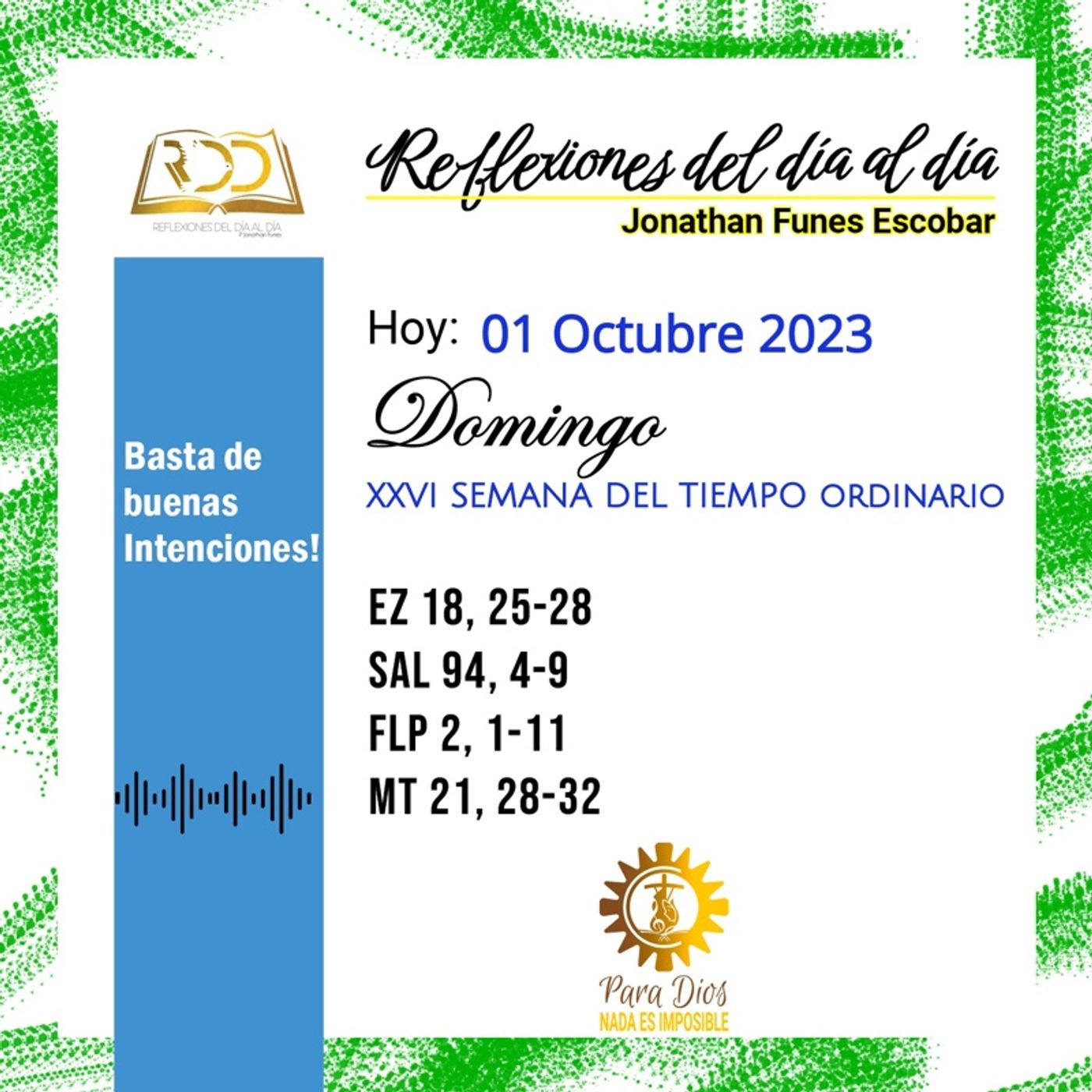 Dicen por ahí que de buenas intenciones está lleno el infierno... expresión dura pero muy cierta!!! Hoy descubrimos en los textos la urgencia de no culpar al Señor por los errores que nosotros mismos cometemos por alejarnos de su Voluntad. El reto de hoy está en trabajar en su viña a pesar de las veces que no queremos y descubrir qué puedo aún arrepentirme y salir a trabajar...