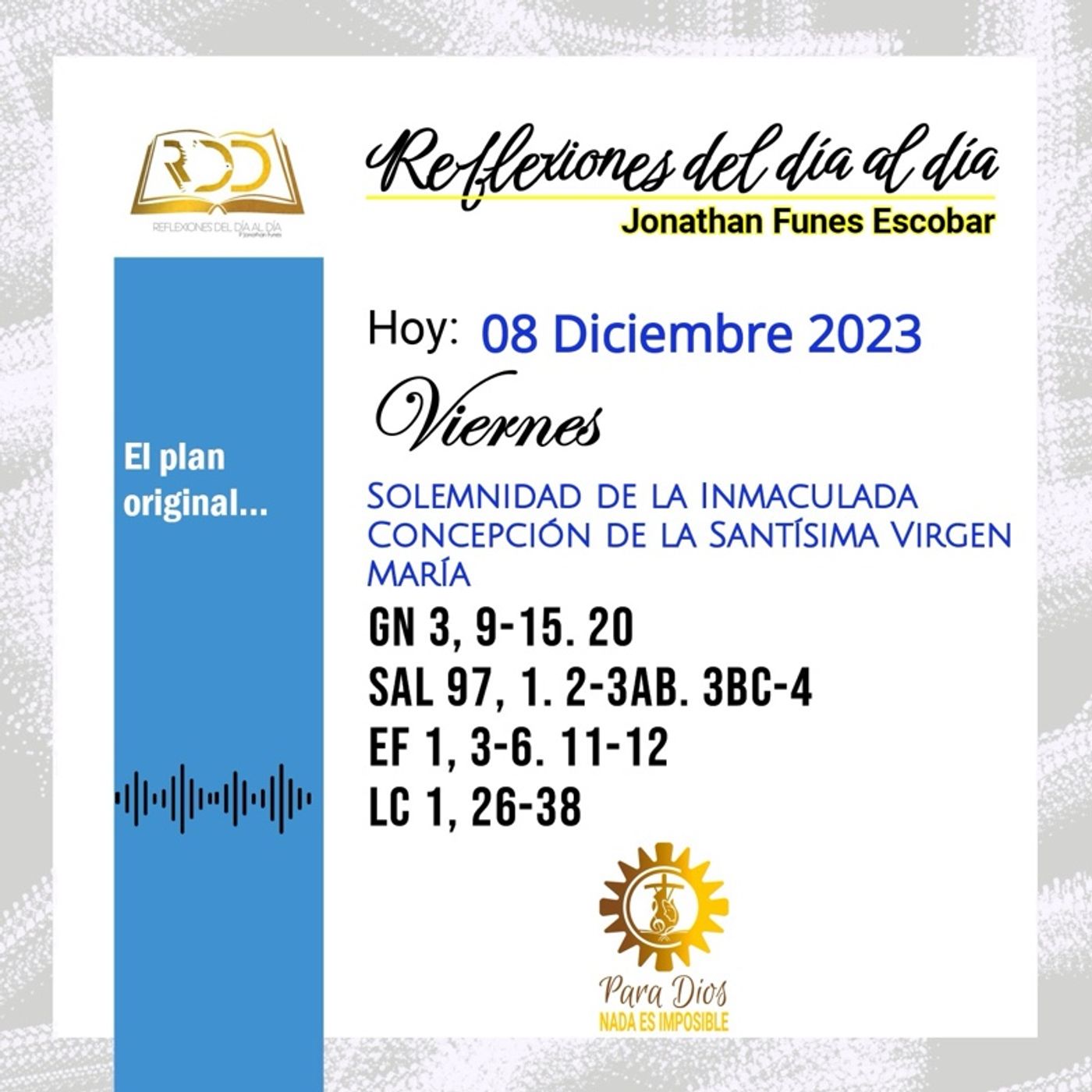 Que bello es creerle a Dios, que lindo es poder dedicar un momento para ilusionarnos con el proyecto original que nuestro Señor tiene para cada uno de nosotros… tal vez por las cosas de la vida te haz equivocado y haz ensuciado tu corazón… Pero hoy una vez más el Señor nos regala la fuerza que viene de Él… Hoy suena fuerte en nuestro corazón la Palabra de aquel que siempre confía en nosotros a pesar de todo y nos sigue llamando a la Santidad desde el ejemplo de nuestra madre Santísima…