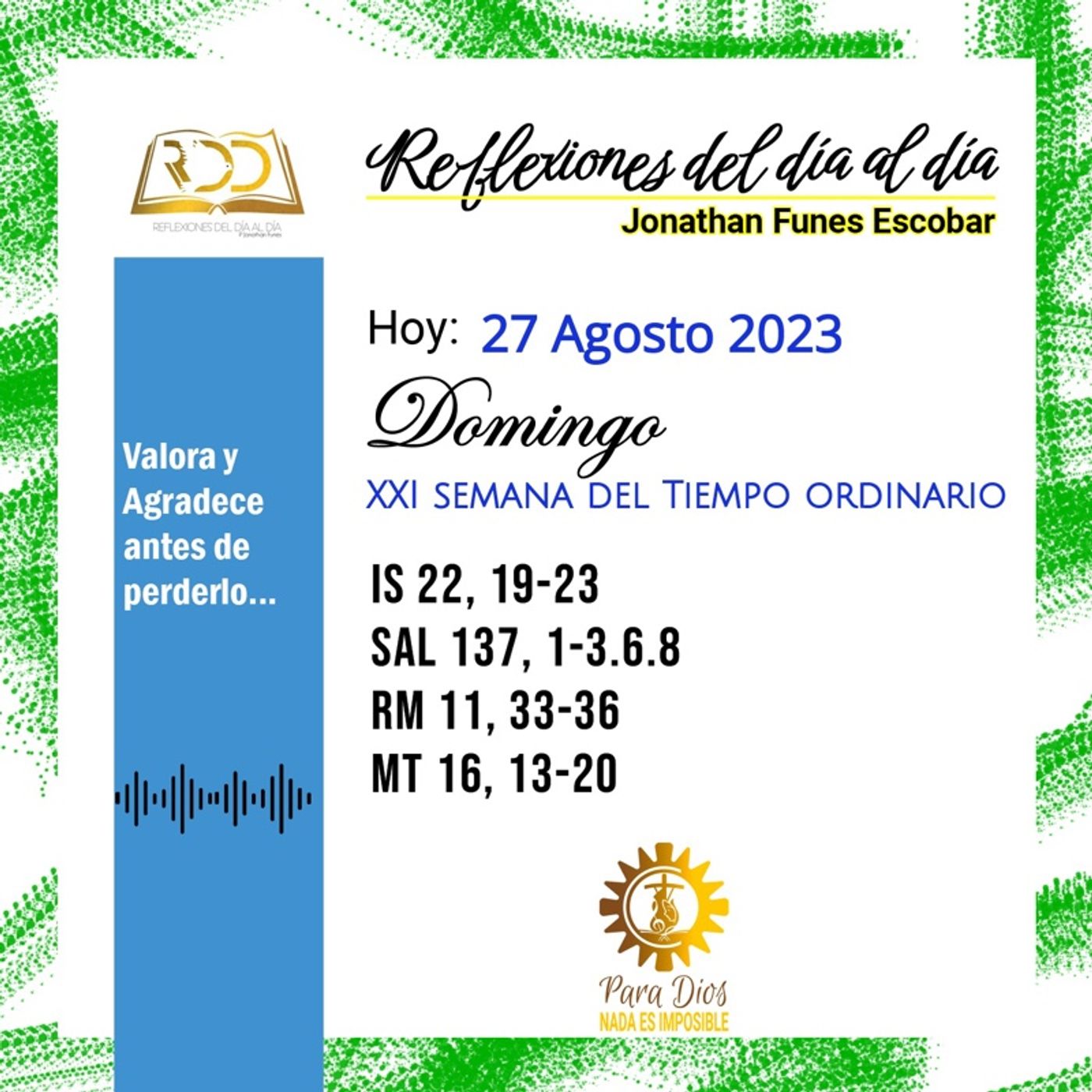 Cuantas veces solemos proclamar como Pedro que el Señor es nuestro Mesías, el Hijo De Dios..., pero decirlo es fácil, vivirlo es el reto. Una manera Verdadera de hacer esto una realidad es expulsando la arrogancia de creer que lo que somos es por puro esfuerzo personal olvidando la intervención divina...