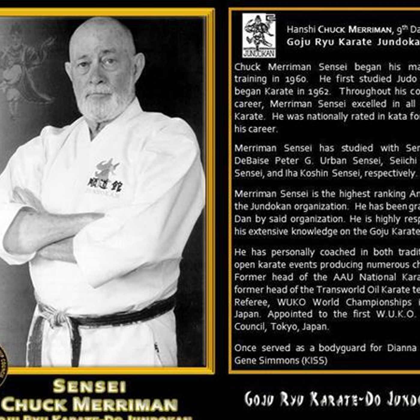 Modern Combat Masters, Host, Professor Darrell Sarjeant, and his Co-Host, Kancho Dan Vena, along with our Executive Producer, Sifu Restita DeJesus, are proud and honored to welcome O'Sensei Chuck Merriman to our program. Merriman has served as Head Coach of the AAU National Karate Team, Chuck Merriman has studied under Peter Urban, Chris DeBaise, Soo H'Wang, Nakabayashi Sadaki, Miyazato Elichi, Iha Koshin. In 1970 Merriman founded Karate International, teaching Goju Ryu to students in the United States. He has been instrumental in popularizing karate in the United States, and goju ryu karate world wide.