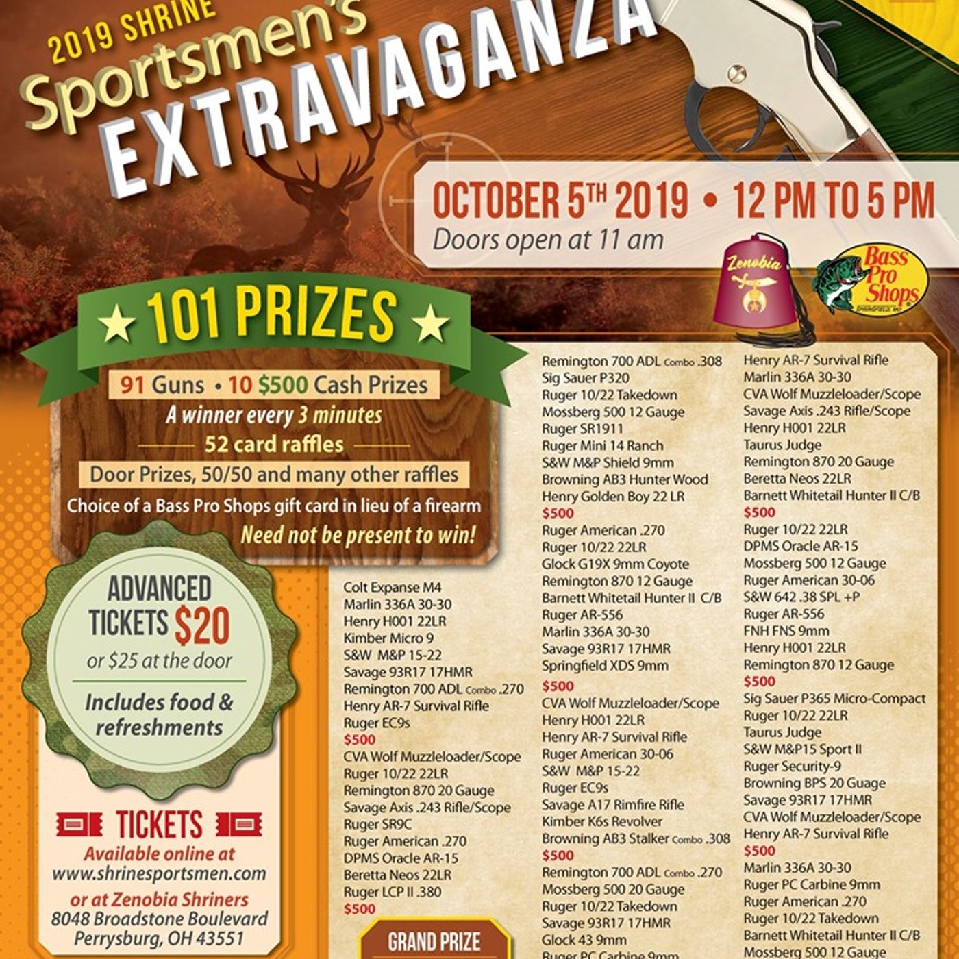 Join them this fall at the Seagate Convention Centre in Toledo, OH for their Sportsmen’s Extravaganza. They will be raffling off 91 firearms AND THOUSANDS of dollars in cash prizes. For the low price of $20 a ticket, you can’t afford not to be a part of this incredible opportunity. Price of admission includes food and beverages.