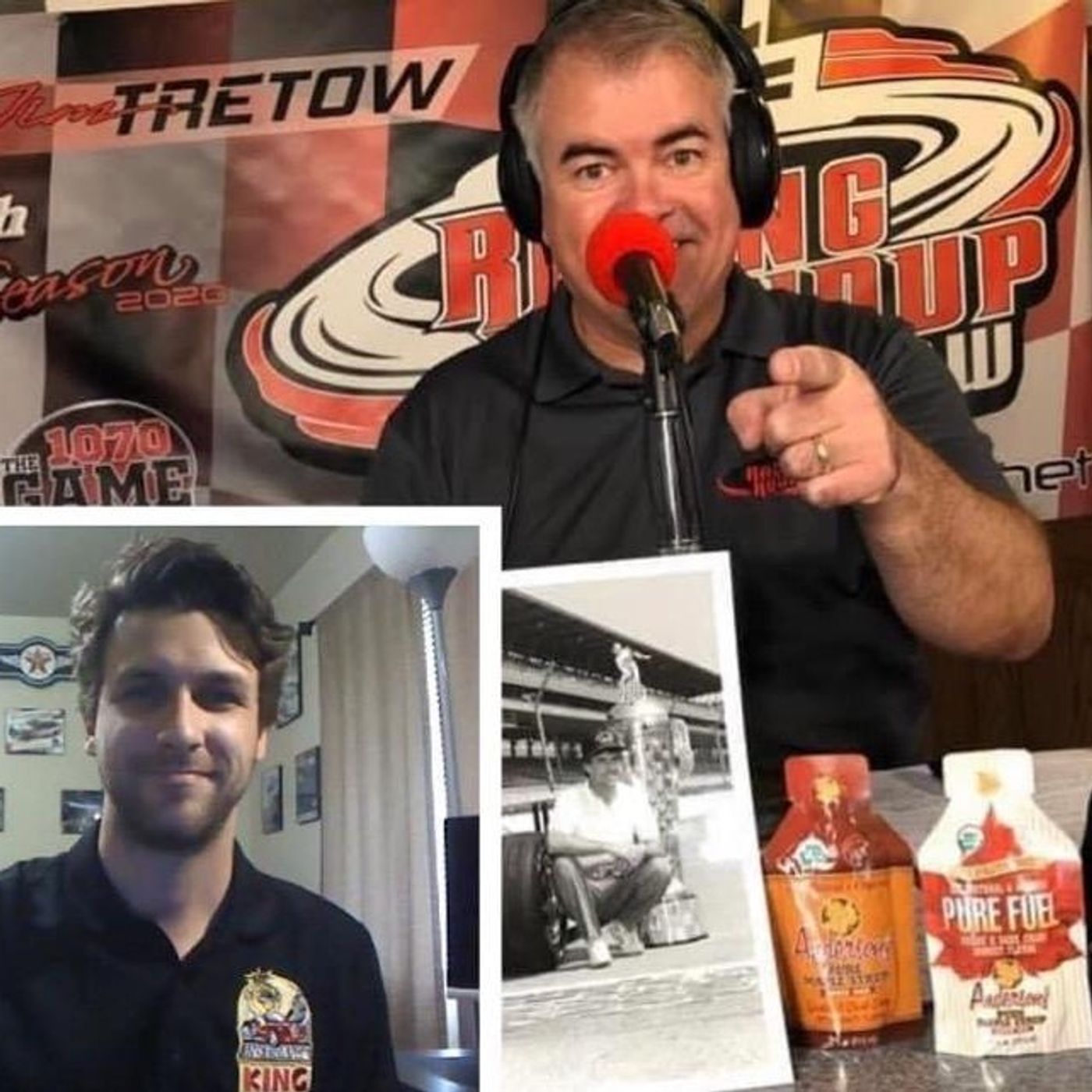 Jim Tretow joined by SLM racer Dennis Prunty, reporter Dean Strom, winged Sprint car racer Josh Walter, NASCAR driver Josh Bilicki