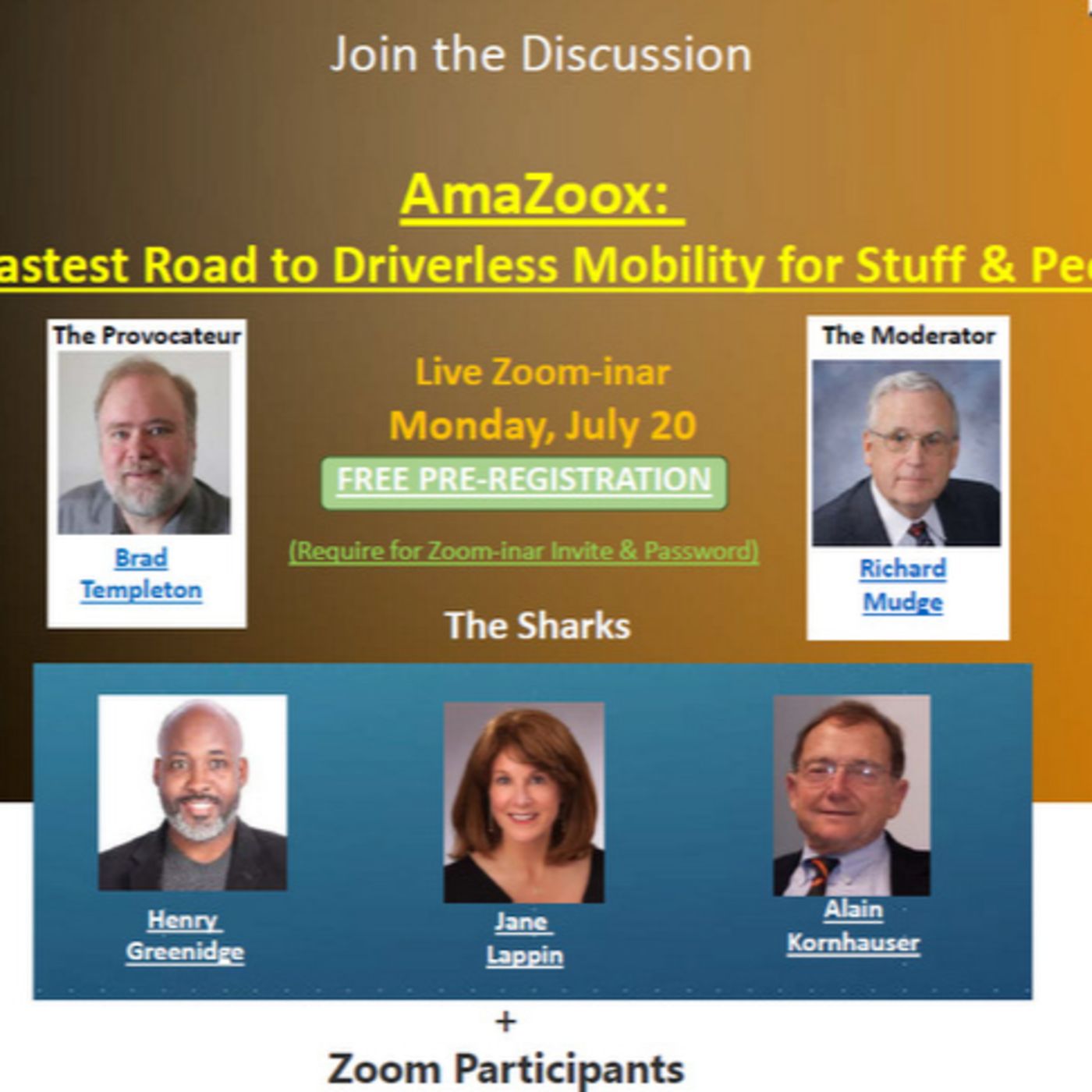 Driving the Debate: Amazon Zoox and beyond features a wide ranging discussion featuring author, consultant and digital age pioneer Brad Templeton, moderator Dick Mudge and a panel chock full of expertise that includes Robin Chase, Alain Kornhauser, Henry Greenidge, Jane Lappin,