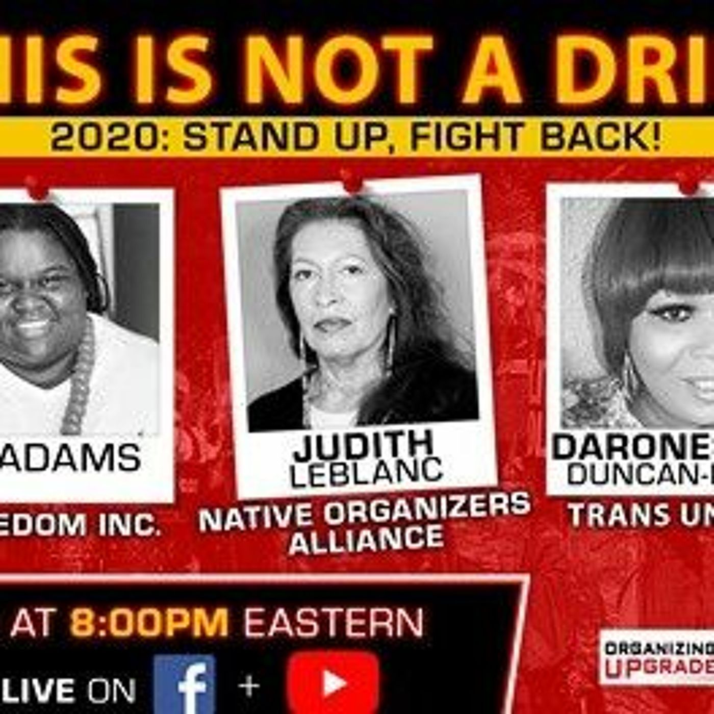 Any strategy about the 2020 elections has to take very seriously the threats and attacks on particular groups and communities. Black, trans, immigrant, and indigenous folks, are organizing hard for radical change and to shape the outcome of the 2020 elections and beyond. In this episode of OrgUp's This Is Not A Drill, hosts Adam Gold and Rishi Awatramani talk with M Adams, Daroneshia Duncan-Boyd, and Judith LeBlanc to understand how groups are organizing to defeat Trump and Trumpism, end the long history of oppression and racist violence against their communities, and win a new world. Morathi Adams, Co-Executive Director of Freedom Inc Daroneshia Duncan- Boyd, Executive Director of Trans United Fund Judith LeBlanc, Director of Native Organizers Alliance